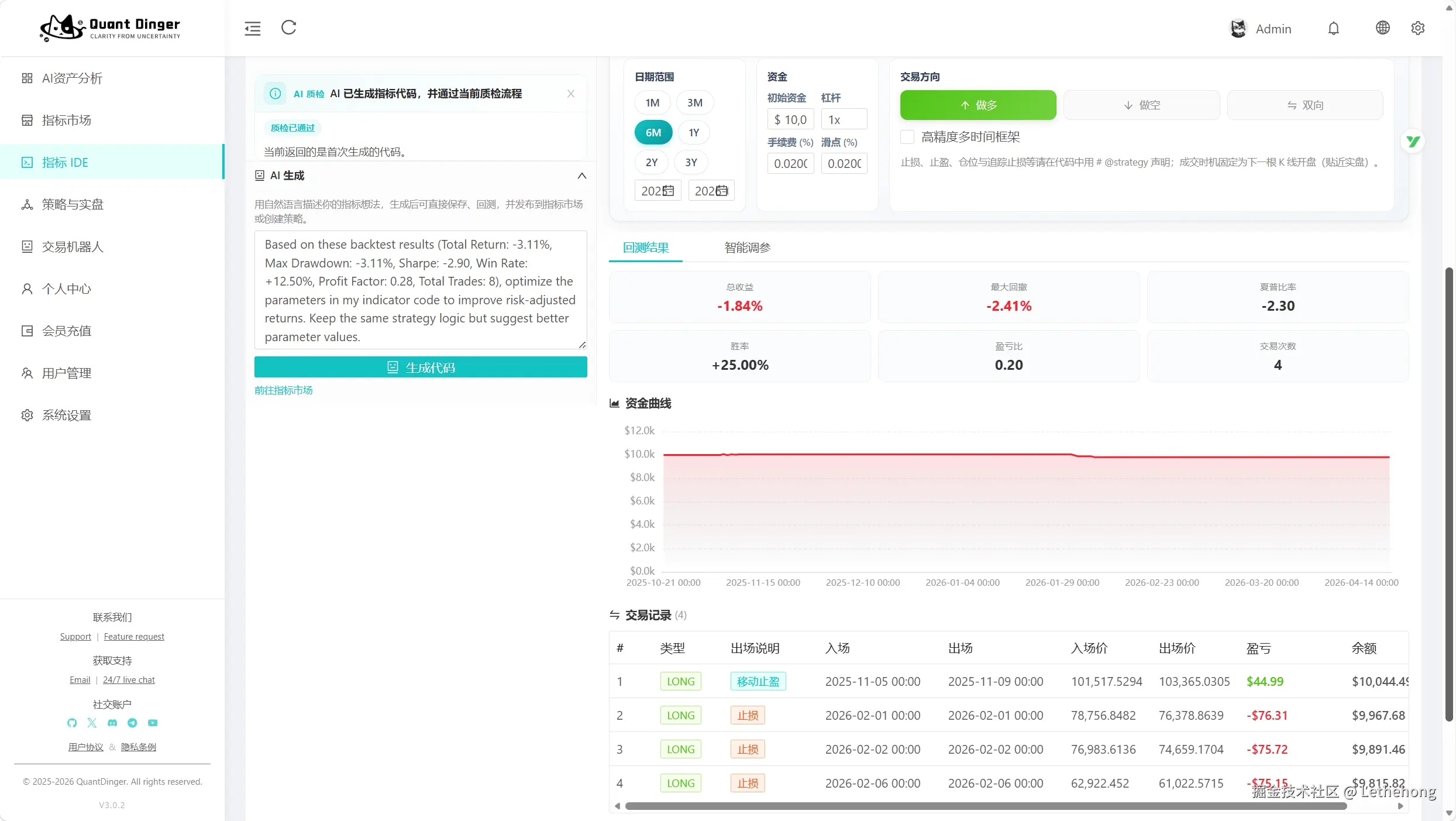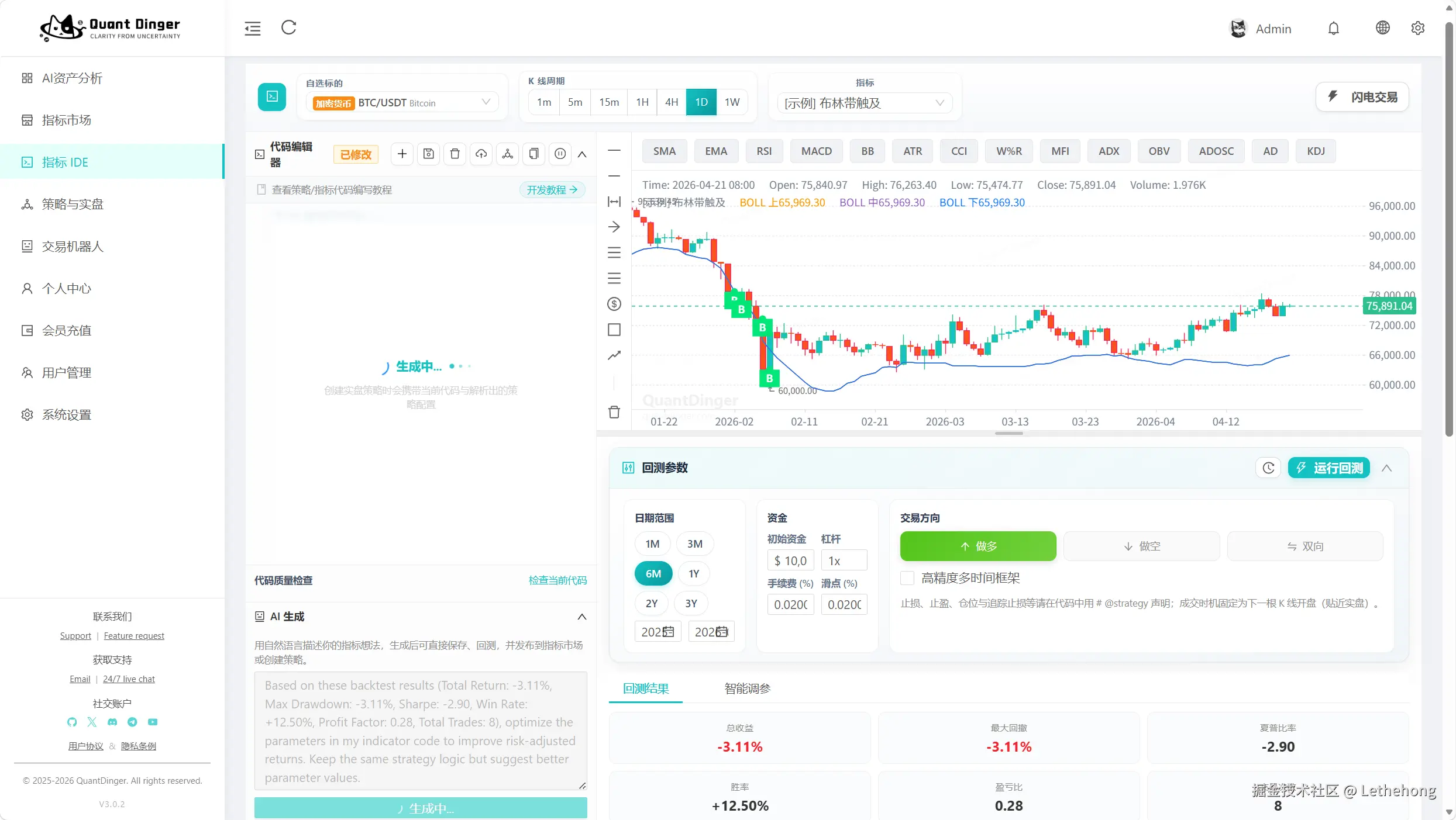 在 QuantDinger 的指标 IDE 里,你可以直接用大白话对 AI 说:“帮我写一个优化版的布林带反转策略,加宽布林带与止损空间,增加移动止盈锁定利润。”
