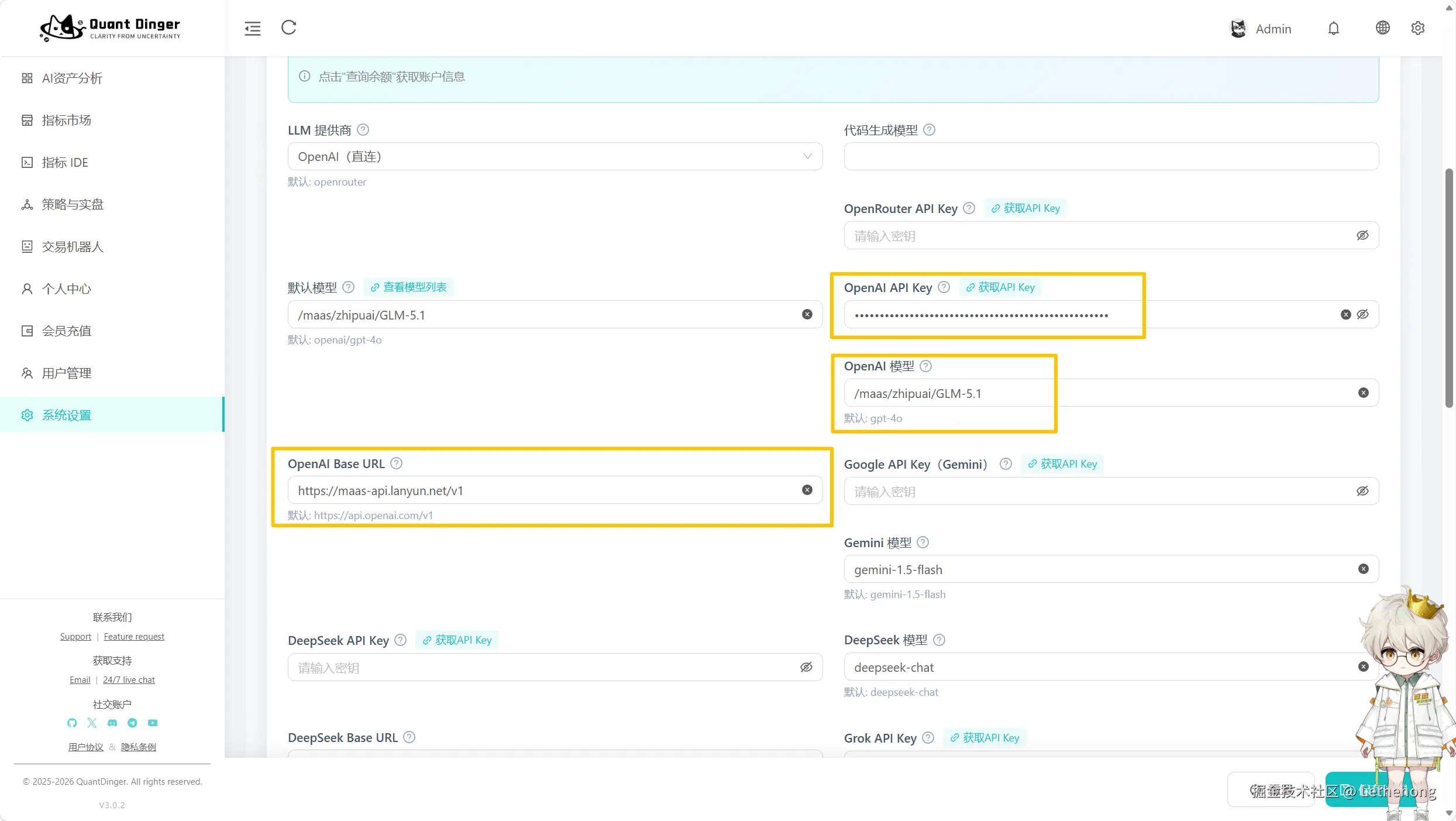 拿到 API KEY 后,回到 QuantDinger 的系统设置页面。你会看到几个输入框,我们需要把刚才的信息填进去: