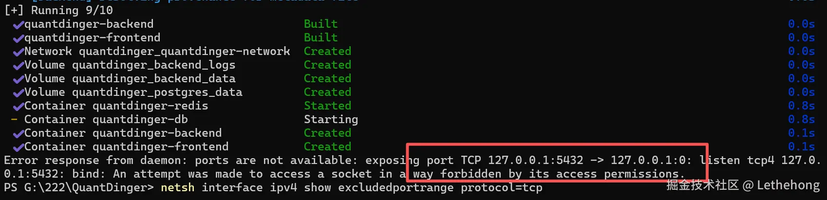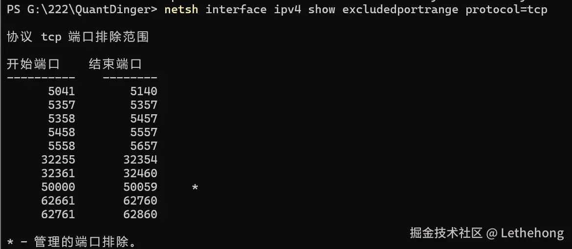 Windows 有一个臭名昭著的机制叫 Hyper-V,它每次重启都会随机“霸占”一批端口(通常是 5000-6000 之间)。如果你的运气不太好,刚好系统占用了 5432 端口,数据库就起不来了。 怎么办? 别慌,在 PowerShell 里敲下面这条命令看看哪些端口被占了。