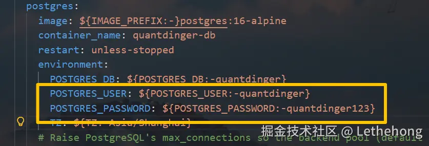 docker-compose.yml里的POSTGRES_USER和POSTGRES_PASSWORD。