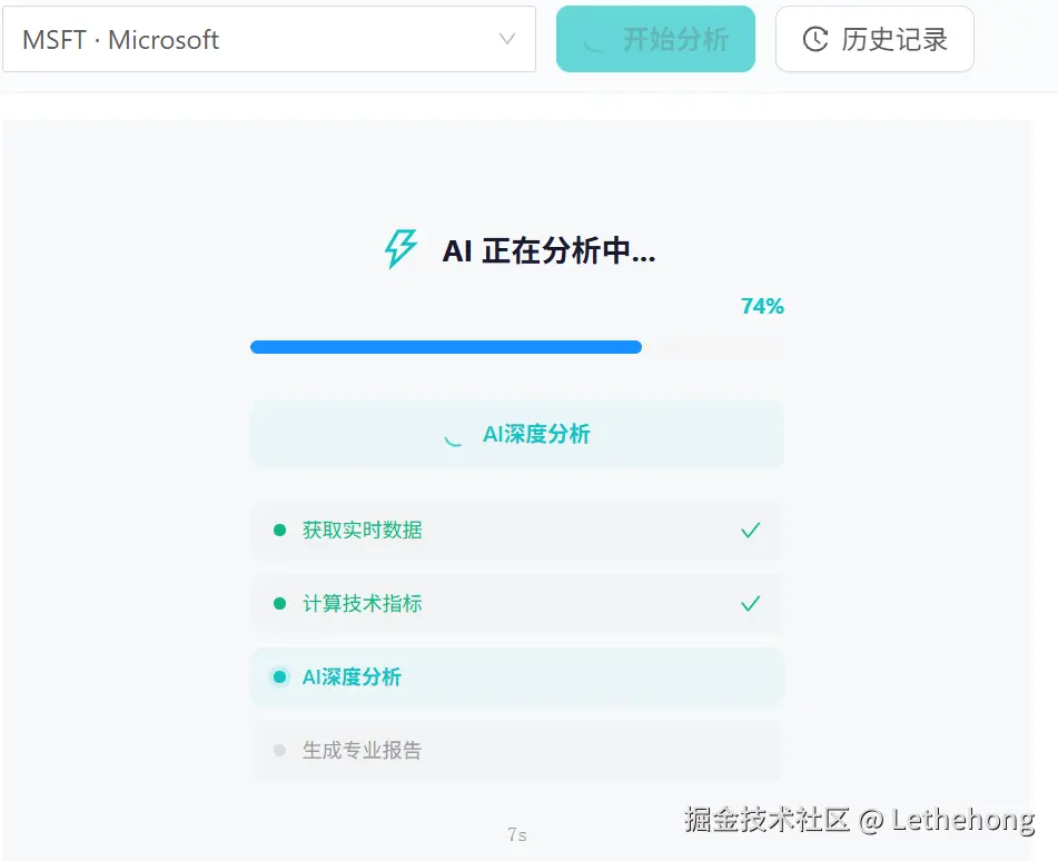 我们在“AI资产分析”模块里,输入美股代码 MSFT(微软),点击“开始分析”。
