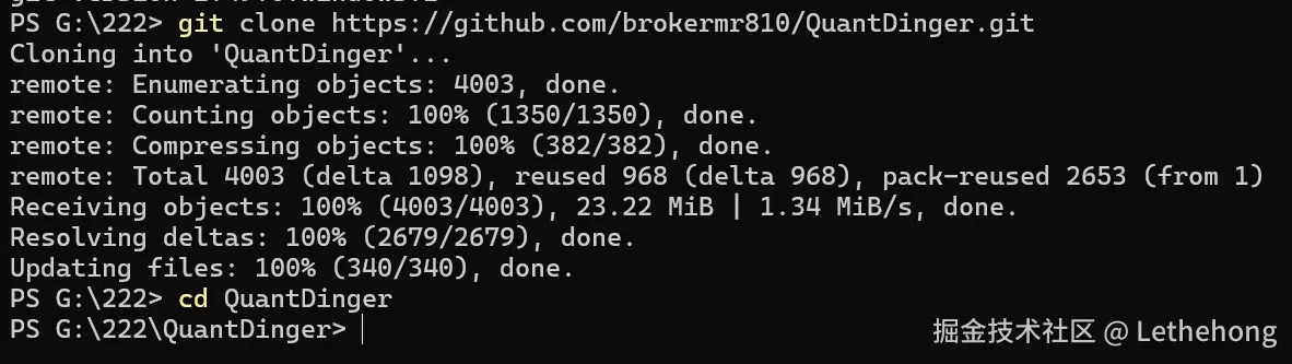 在终端里敲入下面这行代码,回车。它会把 GitHub 上的最新代码完整下载到你电脑上。