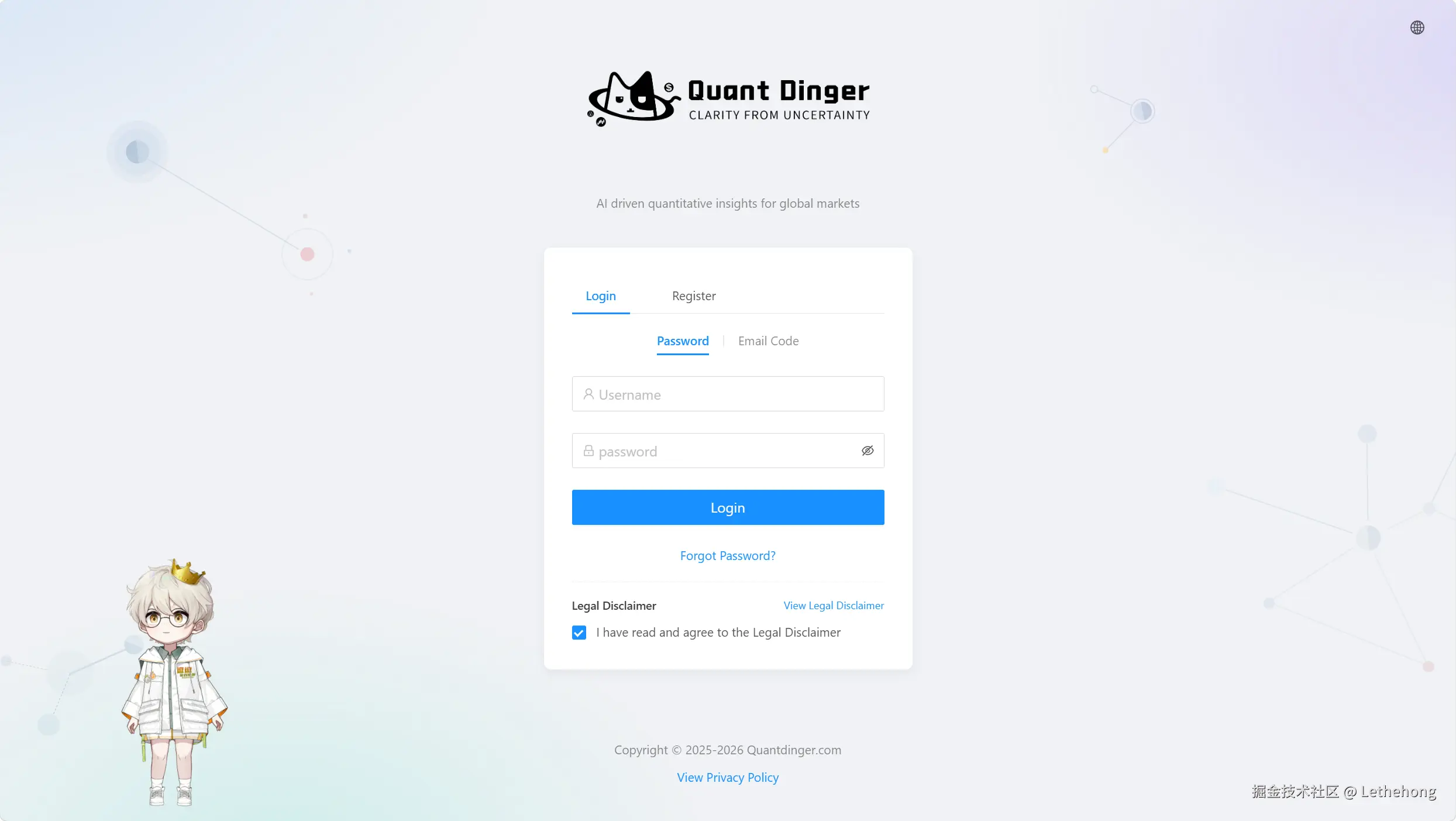 看到登录界面的那一刻,你应该给自己鼓个掌。默认账号密码是:quantdinger / 123456。登录进去的第一件事,赶紧去把默认密码改了!