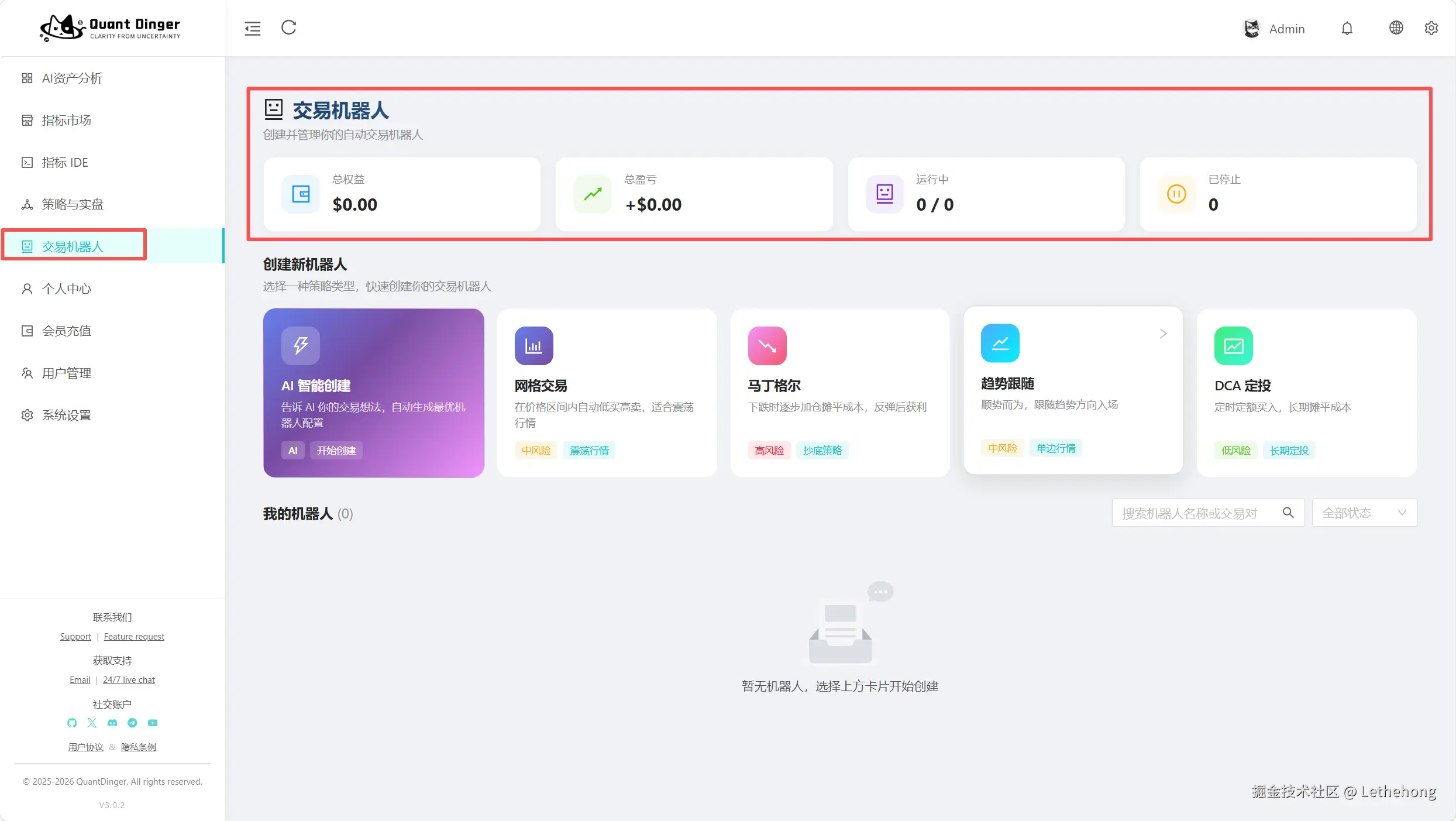 在“交易机器人”模块里,你可以把前面写好的策略配置成不同的 Agent(智能体)。设定好条件后,它甚至可以帮你自动盯盘、自动下发交易指令。