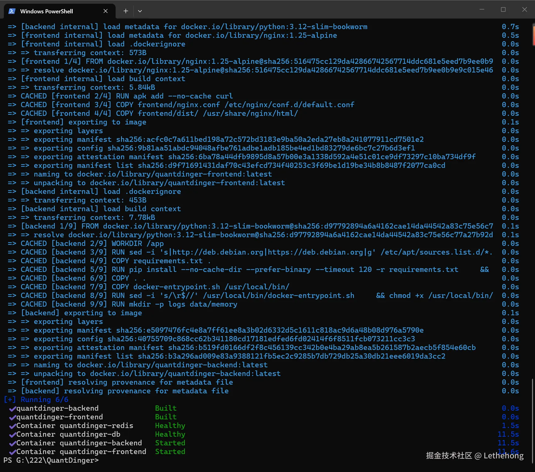 回车之后,你可以去泡杯咖啡了。因为这是第一次启动,系统要跑去网上拉取 PostgreSQL 数据库、Redis 缓存、Python 后端和 Nginx 前端的镜像,还要安装依赖。根据你的网速,大概需要 3 到 10 分钟。你只要看着终端里哗啦啦滚动的代码日志,感受科技的魅力就好。