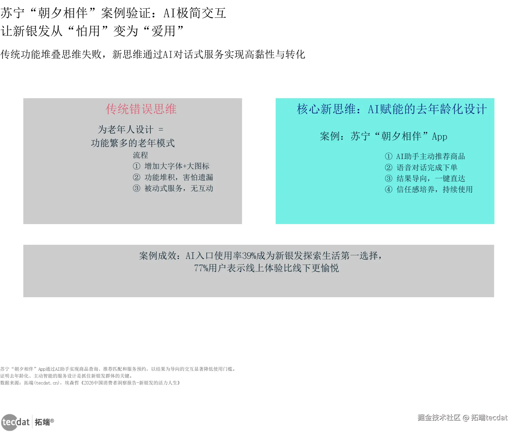 - 重构产品体验,坚守“体面掌控感” :适老化设计的终点不是功能堆砌和操作简化。参考红松的模式,产品和服务应在解决实际痛点的同时,赋予用户选择权和社交身份。用AI技术隐于无形,降低门槛,但绝不剥夺用户的自主决定权和体面感。