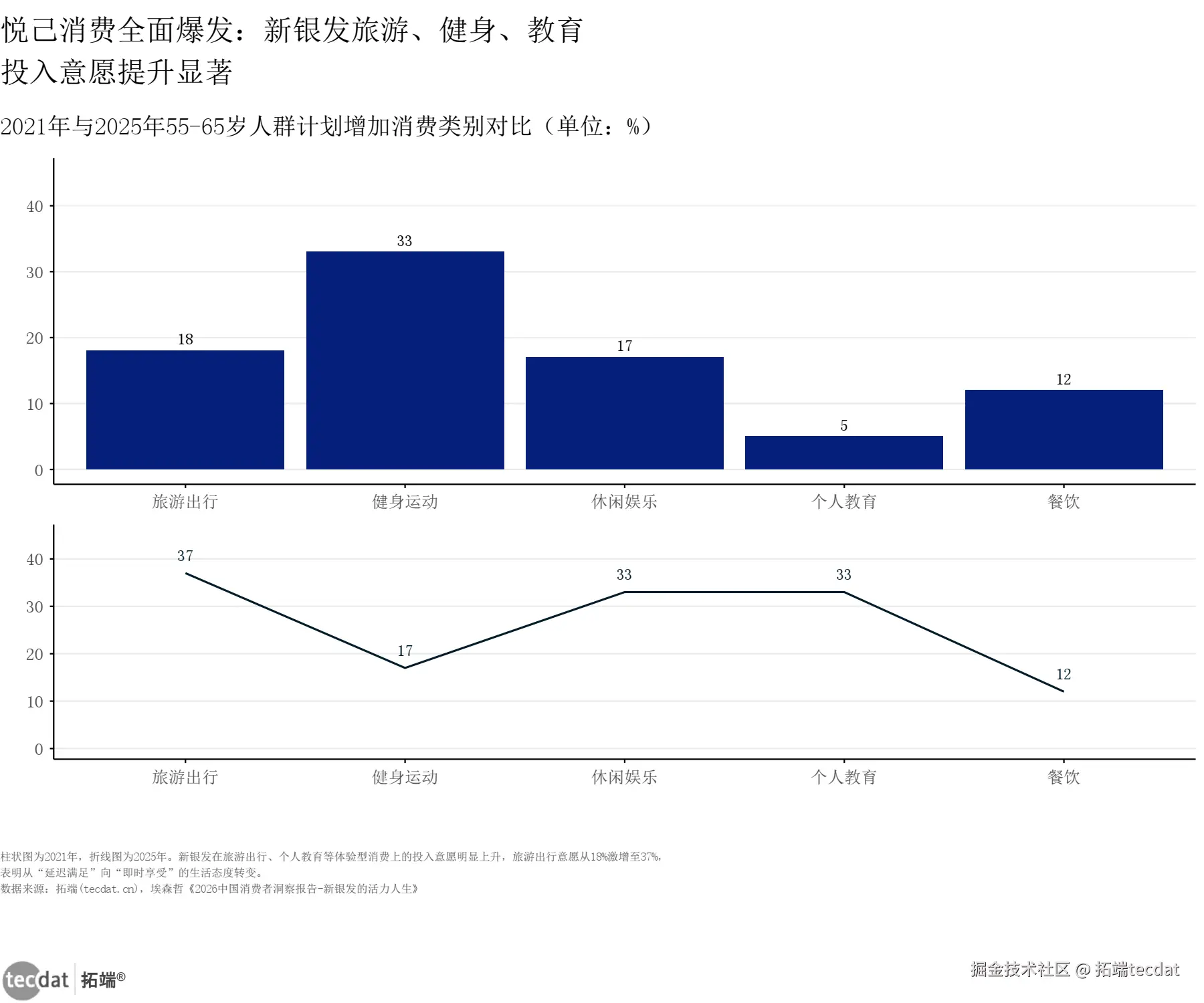 (图2通过柱状与折线的对比,直观呈现了新银发在旅游、运动、教育等体验型消费上投入意愿的显著提升)
