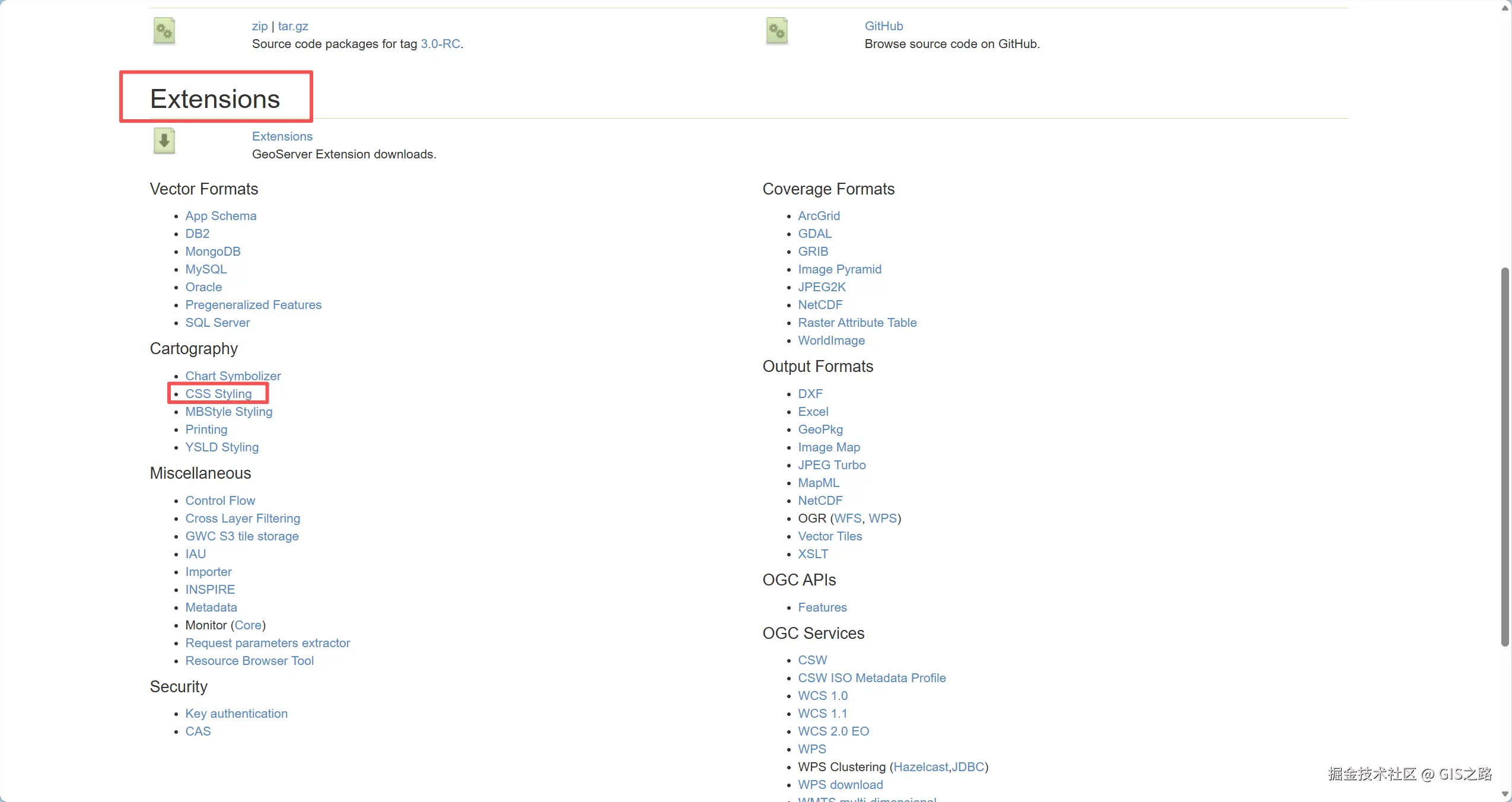 首先打开下载界面,需要注意的是插件的版本最好与GeoServer版本对应。下滑到Extensions选项,然后找到Cartography下的CSS Styling并点击。