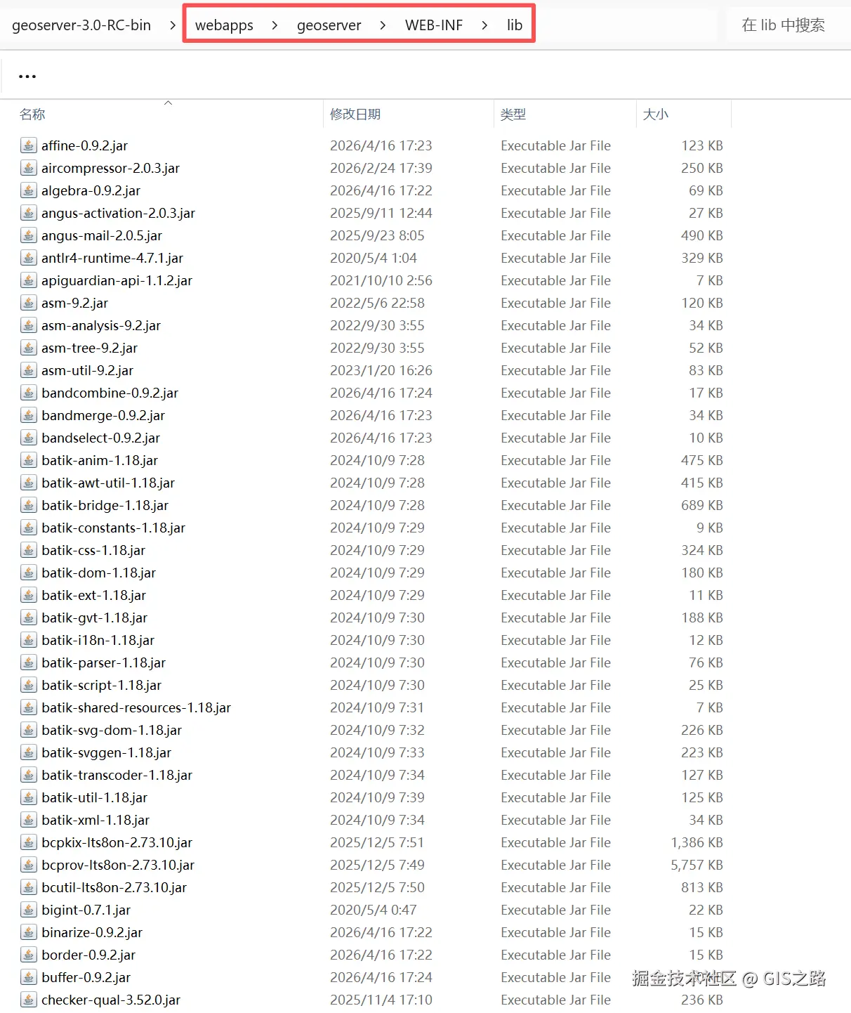 选中所有的.jar包,将其复制到geoserver-3.0-RC-binwebappsgeoserverWEB-INFlib目录。