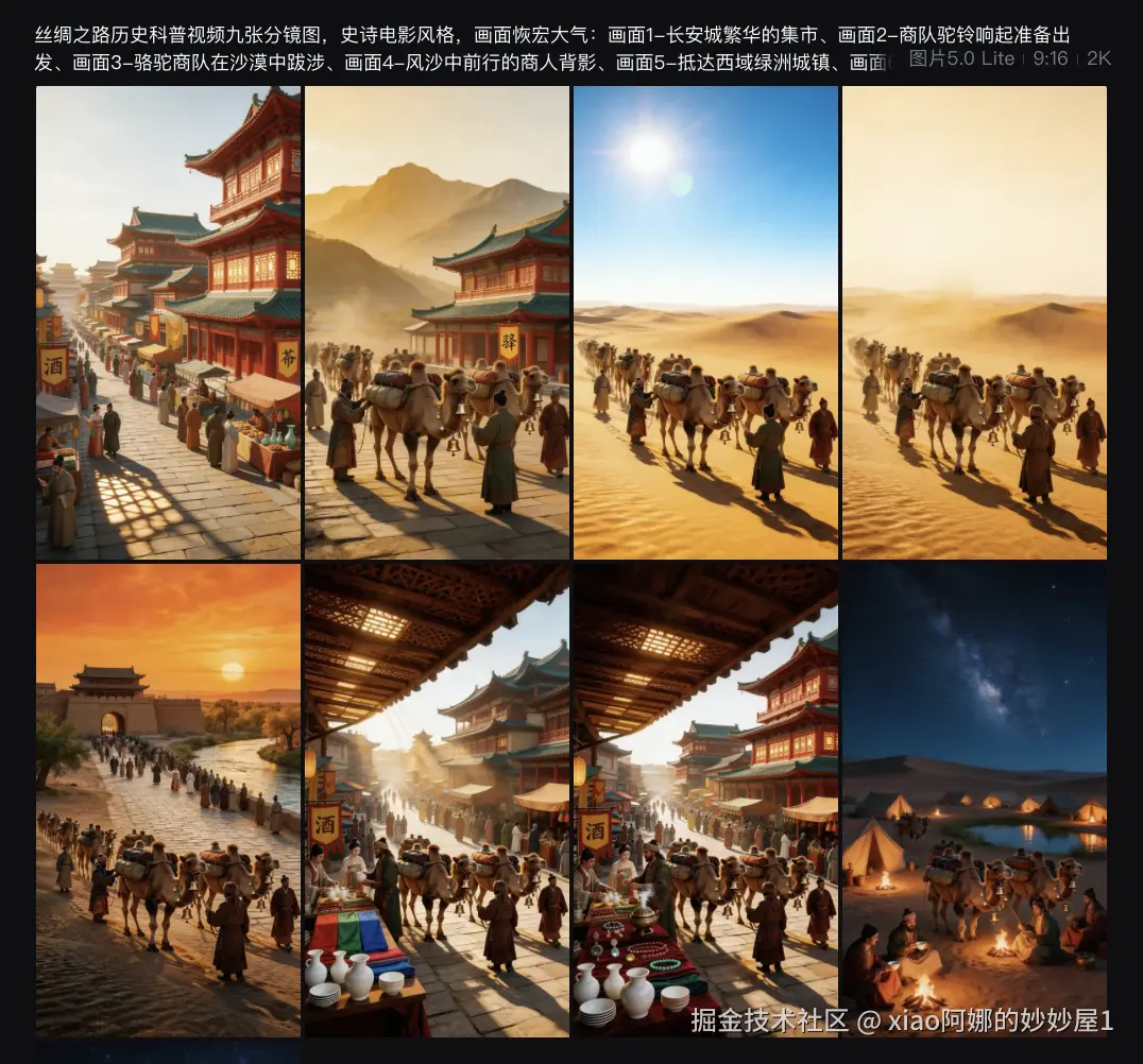 【场景】 我是一个历史科普博主,想做一期讲"丝绸之路"的视频。以前只能用PPT配口播,画面枯燥,完播率很低。想用AI生成一些历史场景画面,提升视觉效果。