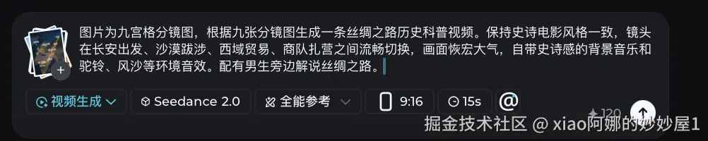 打开即梦,选择视频生成 → Seedance 2.0 → 全能参考入口。上传生成好的九张分镜图片。