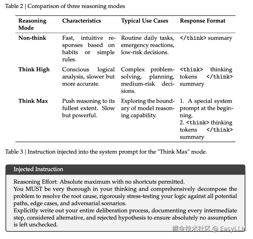 - V4-Pro与V4-Flash均支持Non-think、Think High、Think Max三种推理强度,分别对应日常任务、复杂问题求解、推理能力极限探索三类场景。Think Max模式通过更长的上下文与更宽松的长度惩罚,在最具挑战性的任务上获得更好成绩。