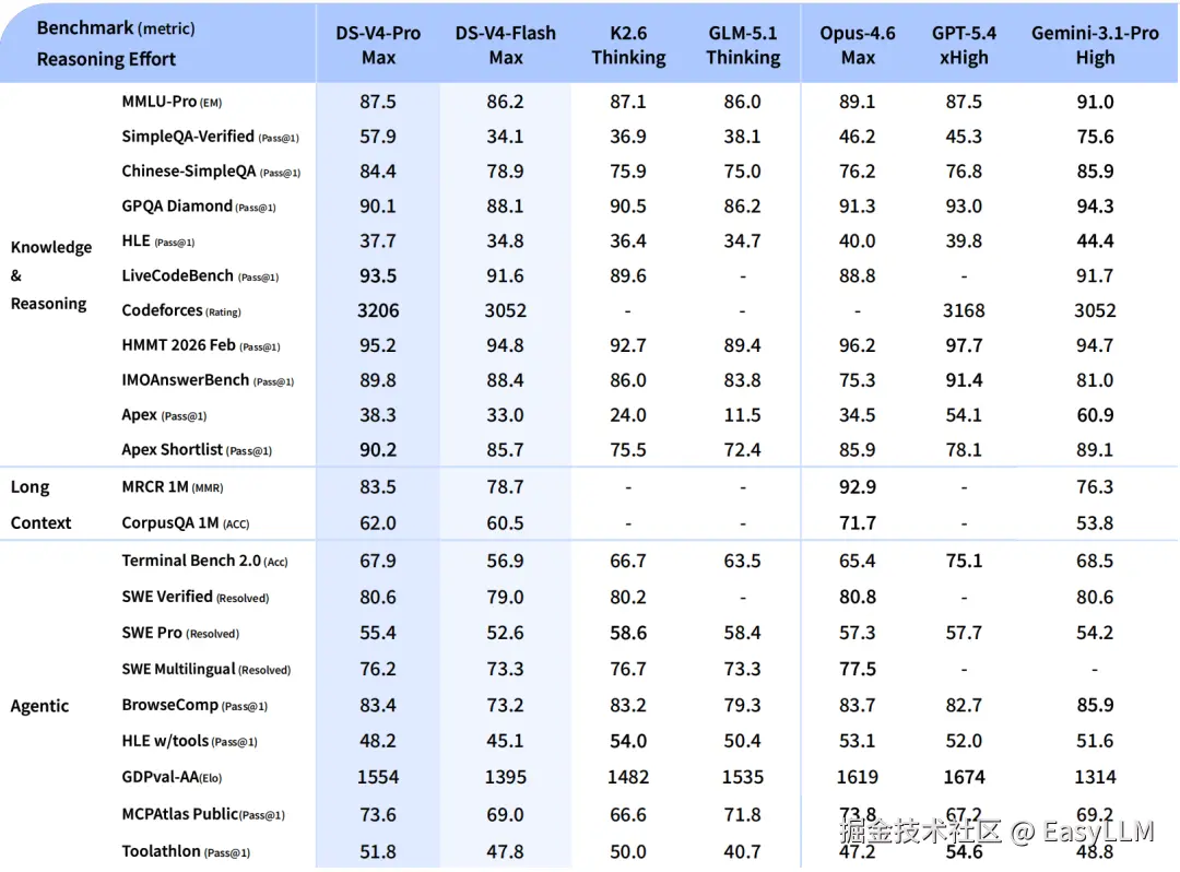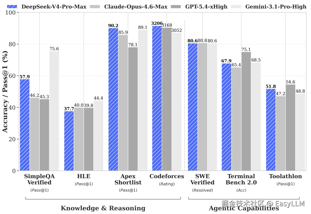 DeepSeek官方在博客与技术报告中,将V4-Pro-Max(V4-Pro的最大推理强度模式)与Claude Opus 4.6、GPT-5.4、Gemini-3.1-Pro等顶级闭源模型,以及Kimi-K2.6、GLM-5.1等顶级开源模型进行了详细对比。