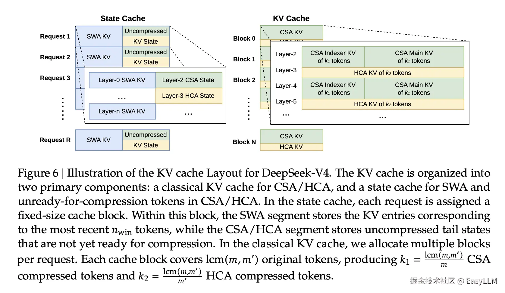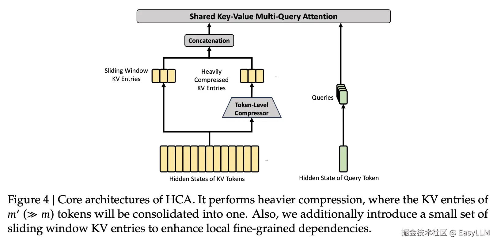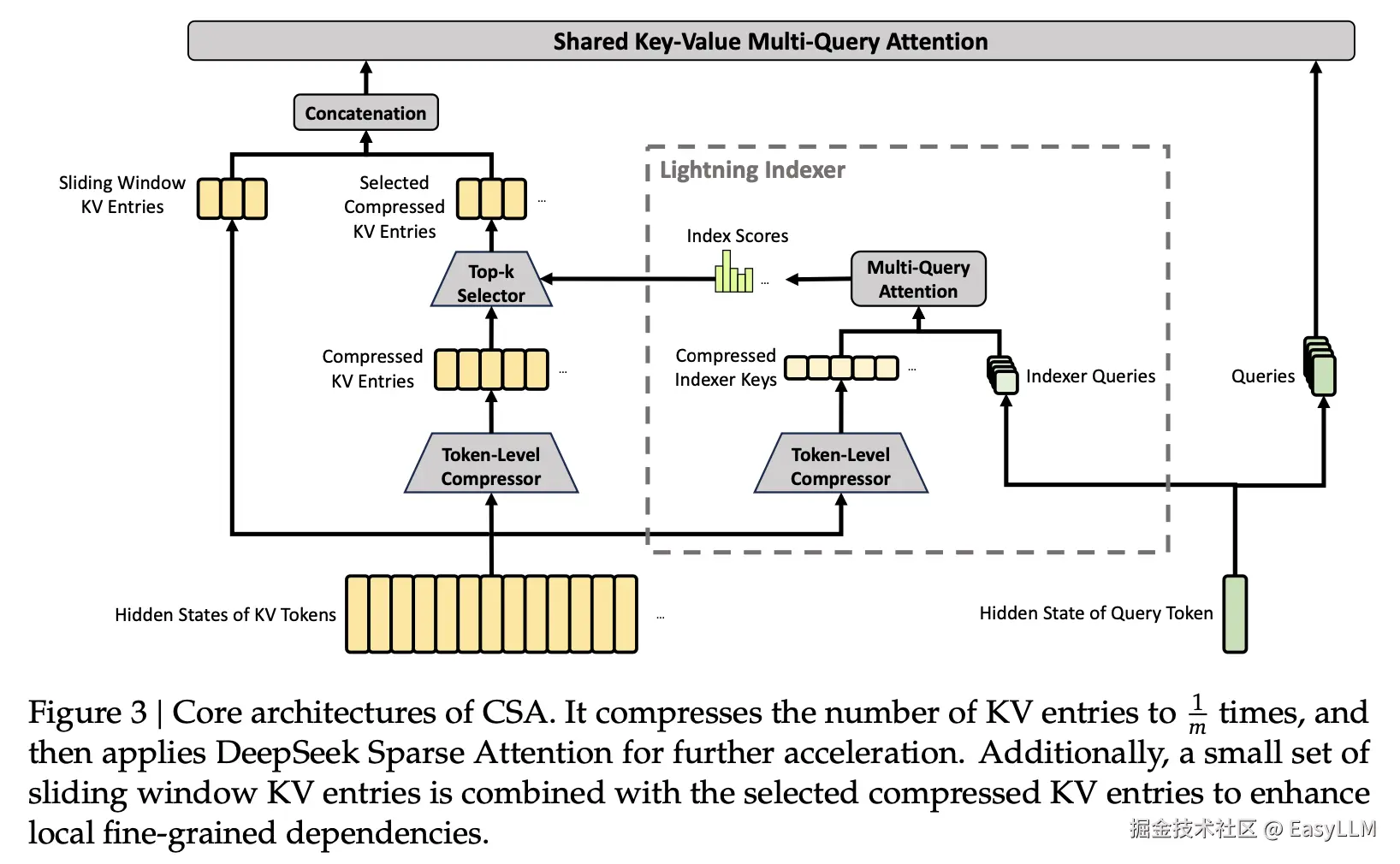 V4系列在DeepSeek-V3的基础上引入了三项关键升级——其一是混合注意力架构,将"压缩稀疏注意力(CSA)"与"重压缩注意力(HCA)"交替使用,CSA通过将每m个token的KV缓存压缩为一项再叠加稀疏注意力。
