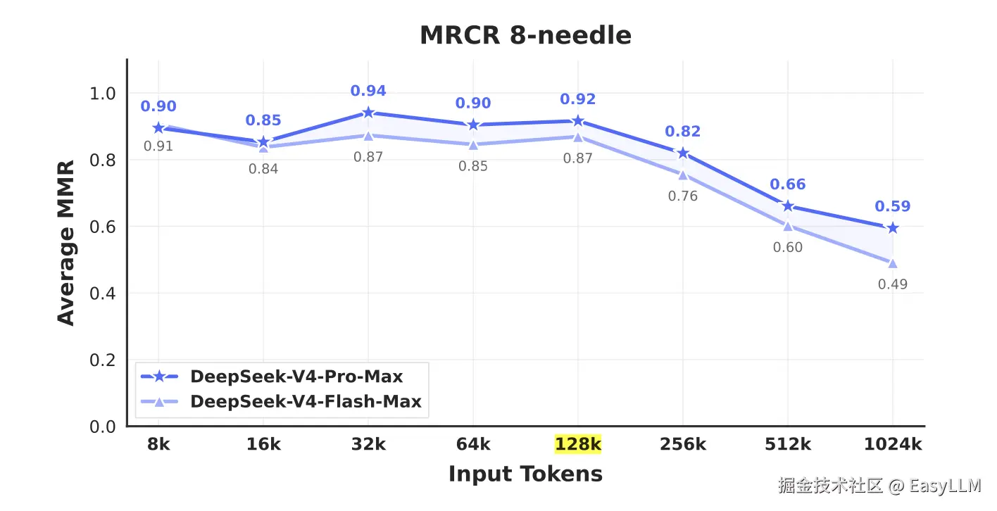 - 长上下文表现: 在百万token级别的MRCR与CorpusQA基准上,DeepSeek-V4-Pro超越Gemini-3.1-Pro,但仍落后于Claude Opus 4.6(MRCR 1M 92.9)。在128K以内的上下文范围中,V4-Pro的检索性能保持稳定,超过128K后才出现可见的衰减。