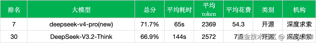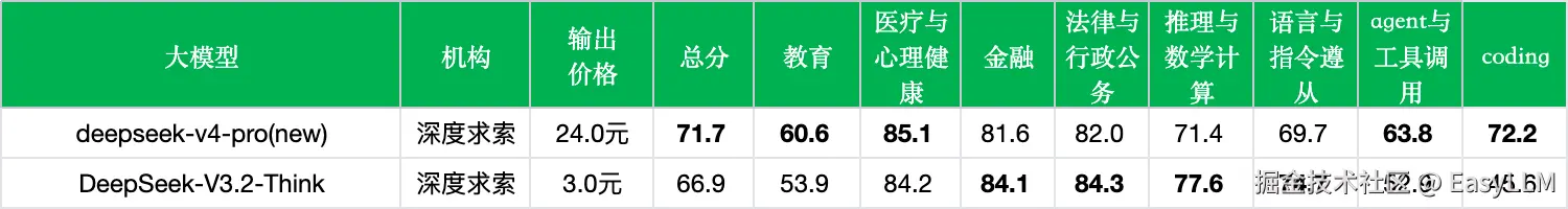 - 自身代际进步明显:相比上一代DeepSeek-V3.2-Think(66.9%,第30位),deepseek-v4-pro在总分上提升了4.8个百分点,排名也从第30位提升至第7位。结合各细分维度看,这次代际升级的本质并非"全面碾压",而是Agent、Coding、教育、长上下文等V4系列重点投入方向的能力补齐。
