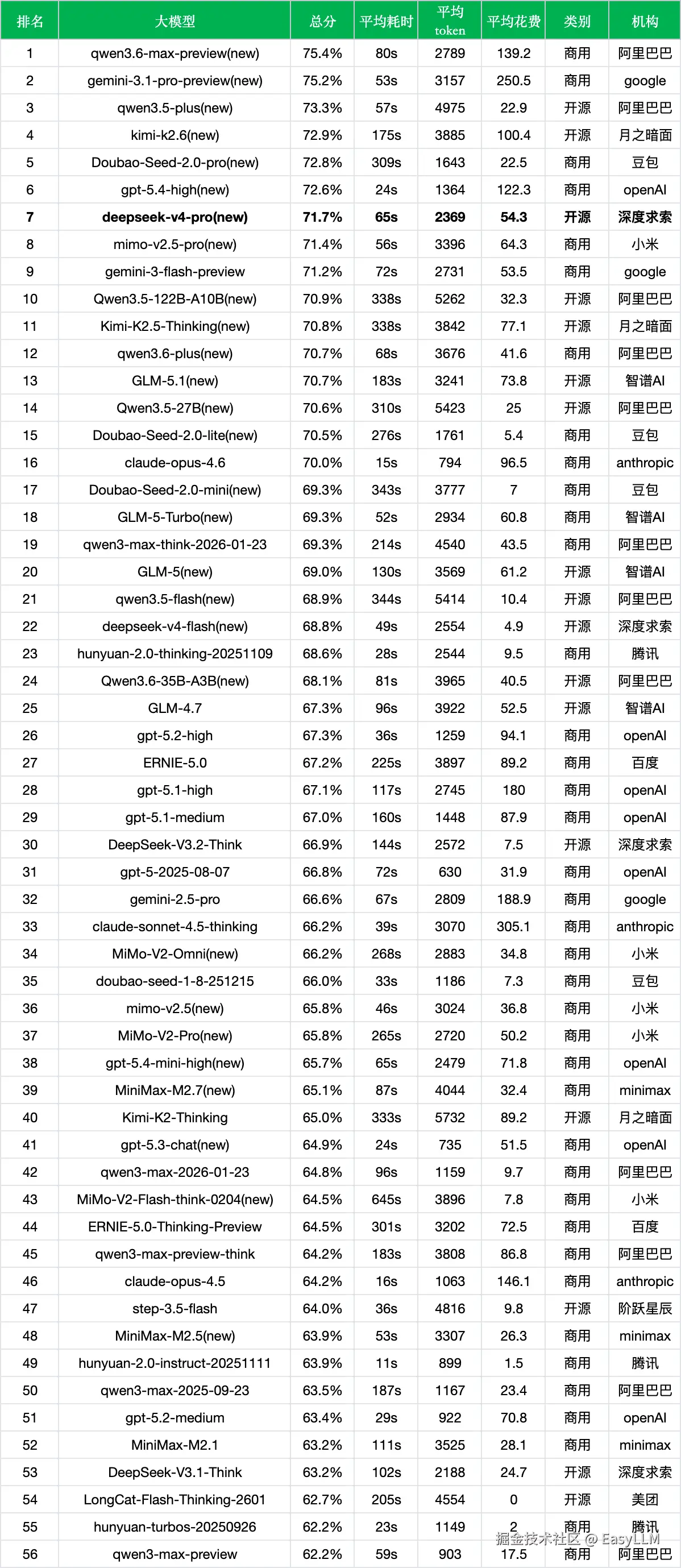 - 与其他厂商新旗舰的对位:榜单前十中,新一代旗舰几乎已完成对老旗舰的替换——qwen3.6-max-preview(75.4%)、gemini-3.1-pro-preview(75.2%)、qwen3.5-plus(73.3%)、kimi-k2.6(72.9%)、Doubao-Seed-2.0-pro(72.8%)、gpt-5.4-high(72.6%)依次排在deepseek-v4-pro之前,差距大多在1至4个百分点之内。
