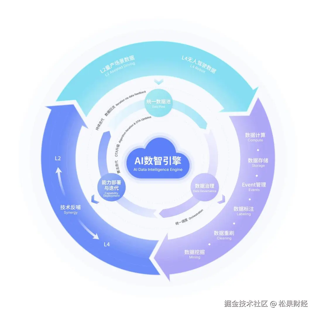 随后,两类数据在统一平台清洗、训练、迭代后,分别反哺两端——L4的高阶模型能力下放,提升量产车性能天花板;L2的规模效应不断摊薄L4的硬件与研发成本。