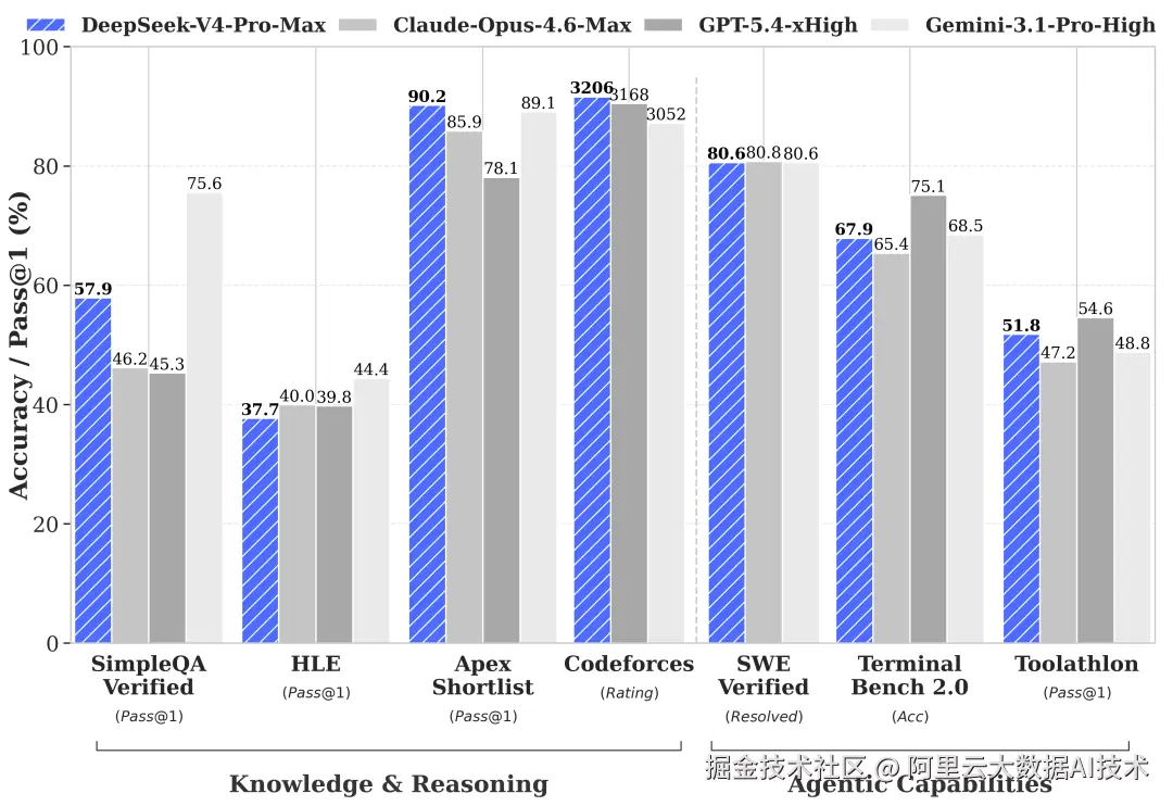 Deepseek-V4-Pro:Agent 能力大幅提高, 在 Agentic Coding 评测中,V4-Pro 已达到当前开源模型最佳水平,且已成为深度求索公司内部员工使用的 Agentic Coding 模型,性能比肩 Claude Opus 4.6 等顶级闭源模型;拥有丰富的世界知识,在世界知识测评中,大幅领先其他开源模型,仅稍逊于顶尖闭源模型 Gemini-Pro-3.1;并拥有世界顶级推理性能。