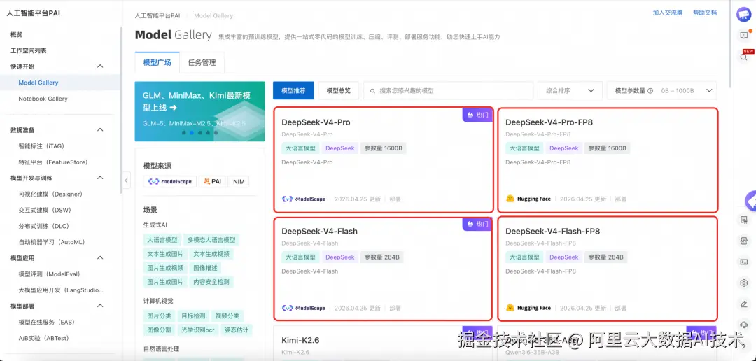 阿里云 PAI-Model Gallery 已同步接入 DeepSeek-V4、Kimi K2.6、Minimax-m2.7、GLM-5.1 与 Qwen3.6-35B-A3B 等最新主流模型,提供企业级部署方案。