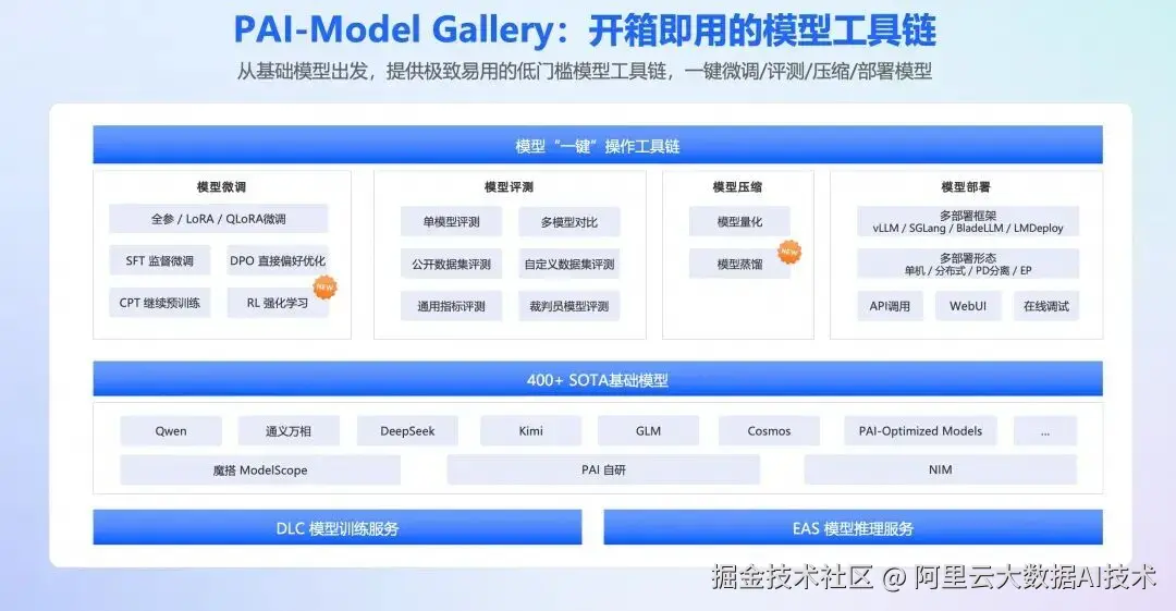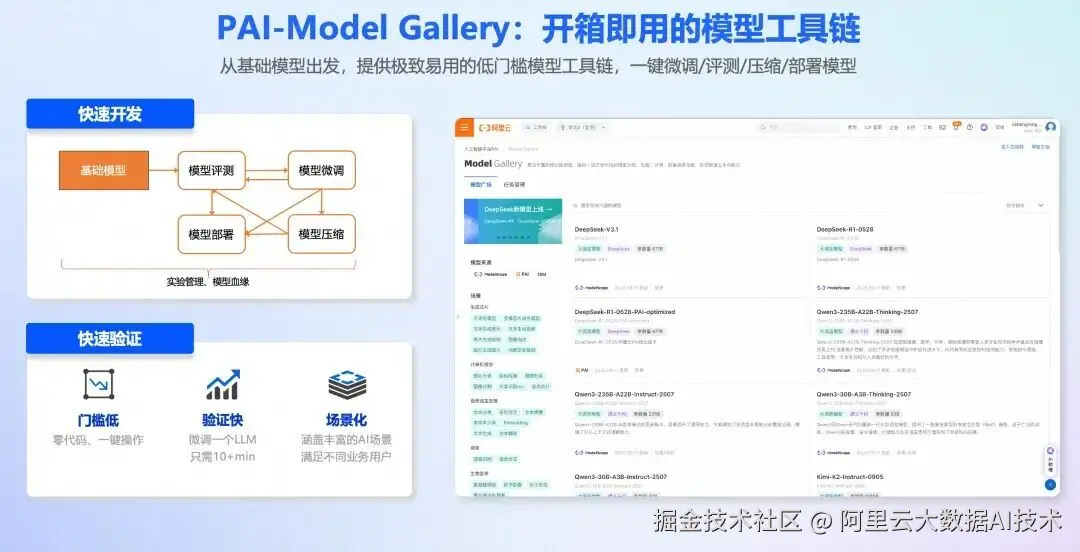Model Gallery 是阿里云人工智能平台 PAI 的产品组件,它集成了国内外 AI 开源社区中优质的预训练模型,涵盖了 LLM、AIGC、CV、NLP 等各个领域。通过 PAI 对这些模型的适配,用户可以以零代码方式实现从训练到部署再到推理的全过程,简化了模型的开发流程,为开发者和企业用户带来了更快、更高效、更便捷的 AI 开发和应用体验。