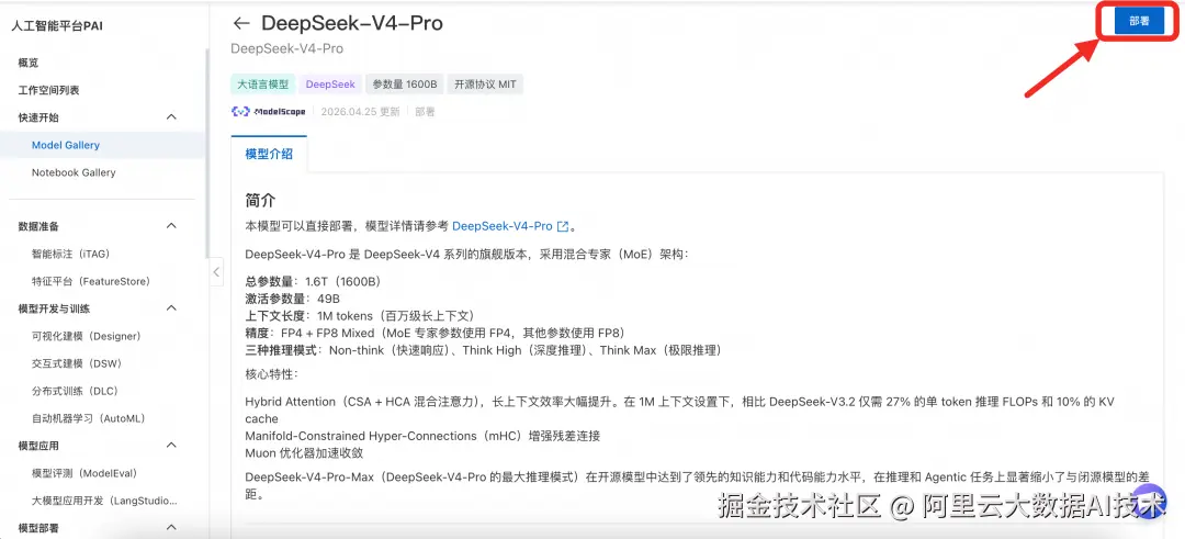 1. 在 PAI-Model Gallery 模型广场找到 DeepSeek-V4-Pro、DeepSeek-V4-Flash 模型,或通过链接直达该模型:
