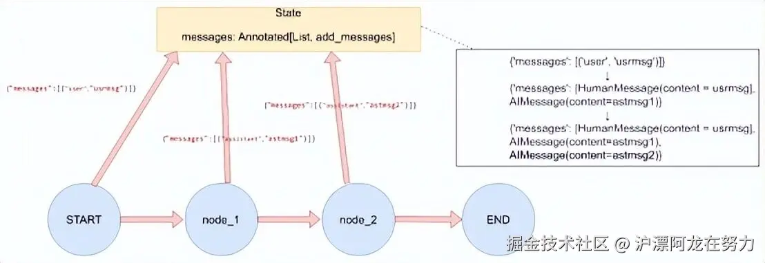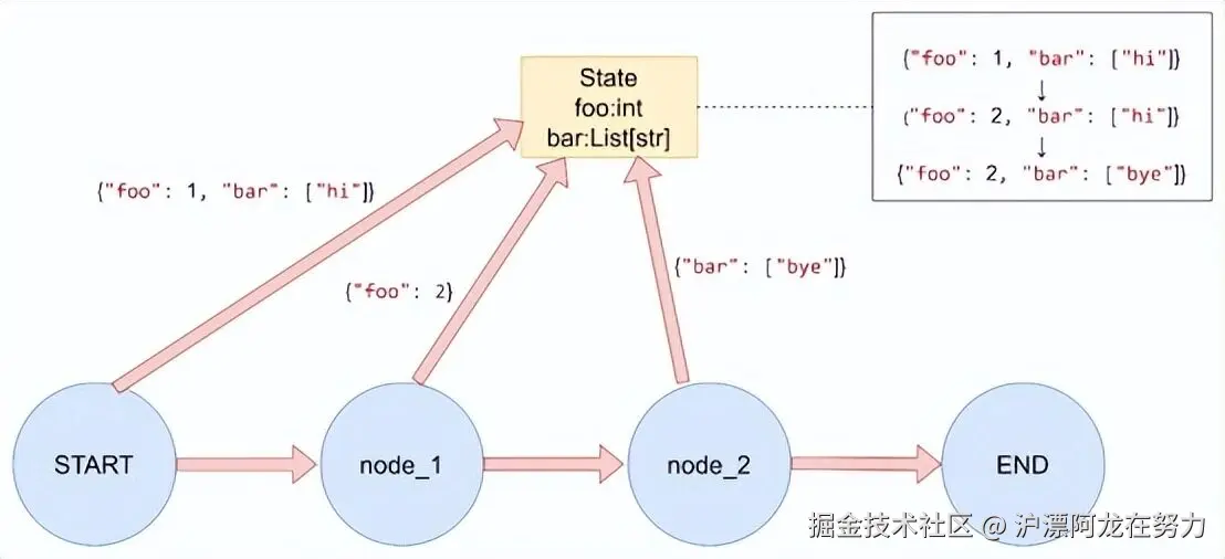 简单来说,State就是一个存储全局数据的容器。当图开始执行时,LangGraph会自动创建一个State对象,将所有节点的输入输出都汇总到这个对象中。每个节点读取State中的数据进行处理,然后把更新结果返回给LangGraph,LangGraph再将这些更新合并回State。