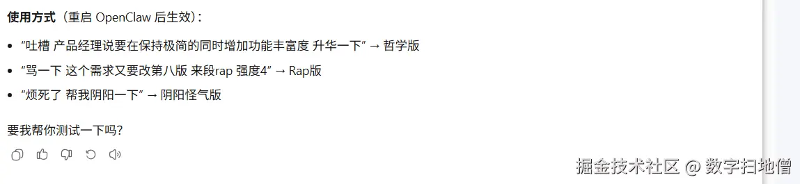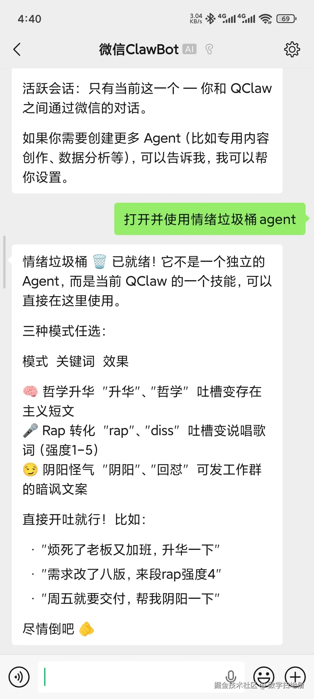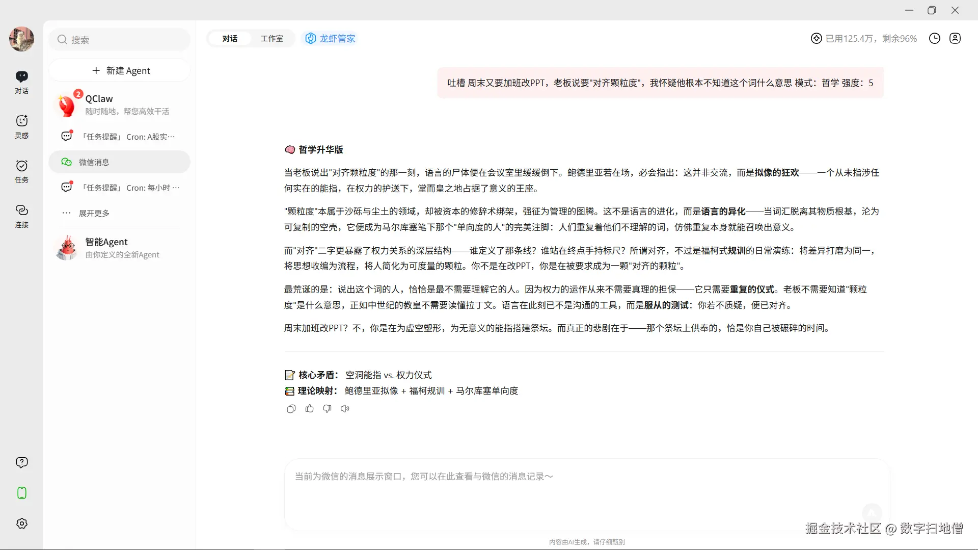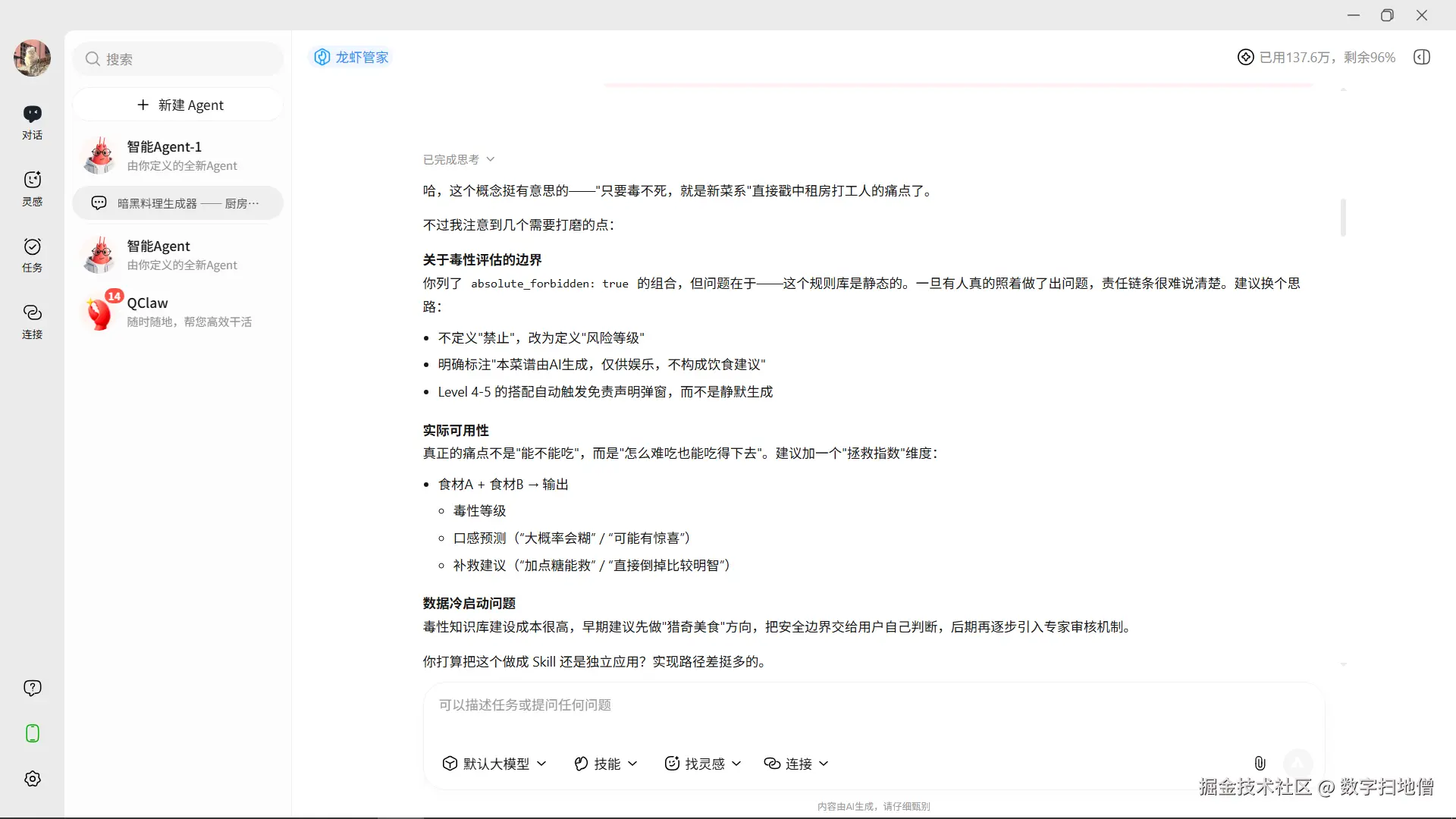 于是,我花了两个周末,基于QClaw开发了三个"邪修"Agent:一个会把职场黑话转化为存在主义哲学的情绪垃圾桶、一个专门推荐"理论上能吃"的暗黑料理的厨房化学家,以及一个通过社死压力倒逼自律的睡眠督察员。