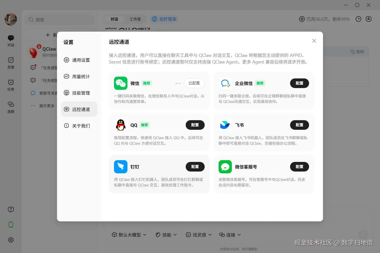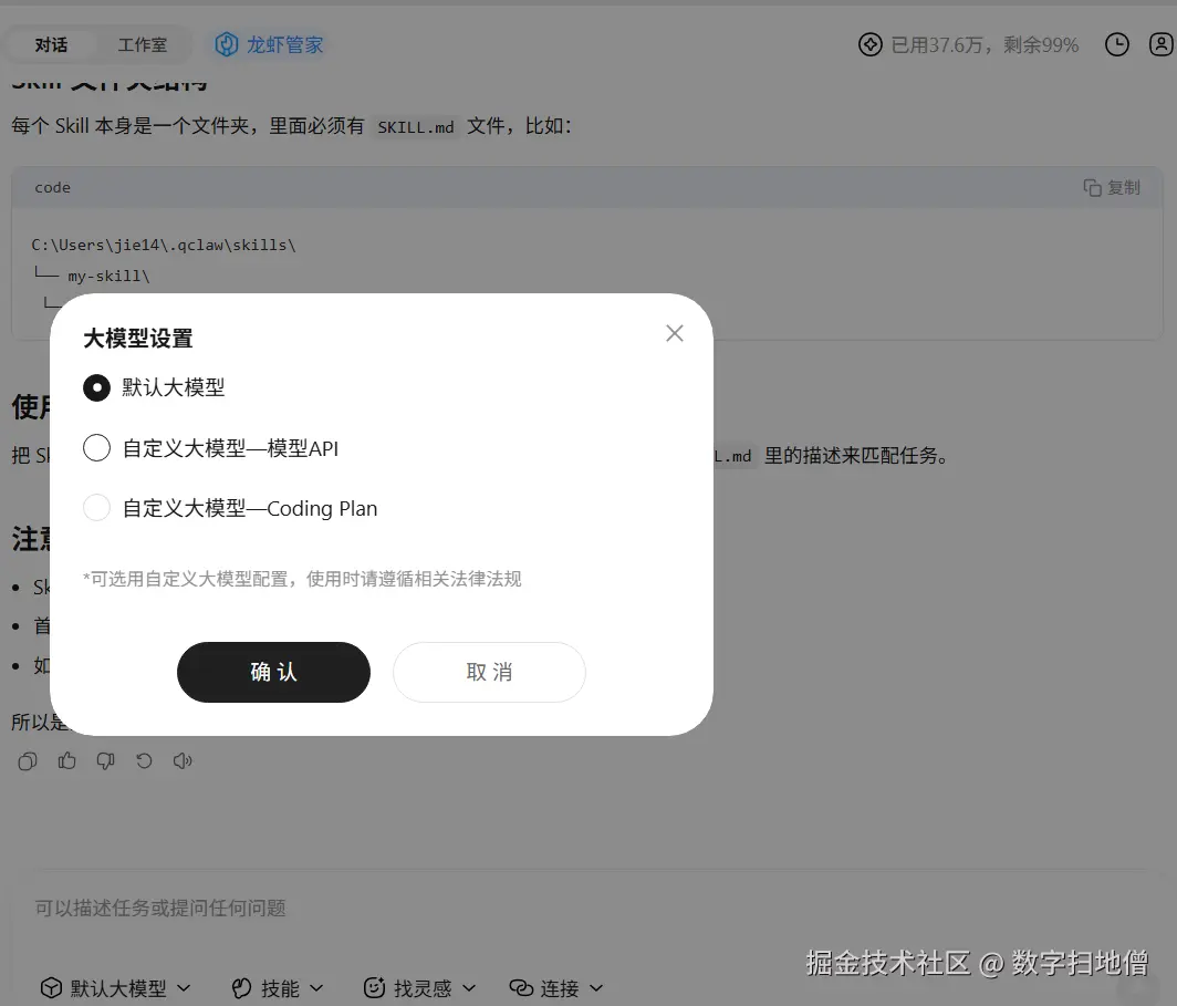 接下来是模型配置。QClaw内置了Kimi、MiniMax、GLM等国产大模型,内测期间免费。但对于我们的"情绪垃圾桶"和"暗黑料理"场景,我建议在设置中切换到自定义模型,接入DeepSeek-R1或Claude 3.5 Sonnet,因为这两个场景对模型的创意生成能力要求较高,需要更强的"胡说八道"功底(划掉)创意发散能力。