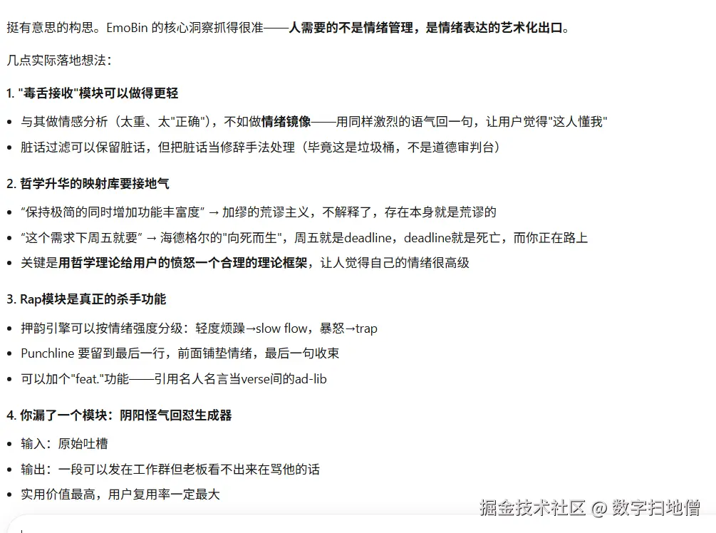 接收用户的职场/生活吐槽,将其转化为哲学思考或Rap歌词,实现情绪宣泄与素材积累的双重价值。
