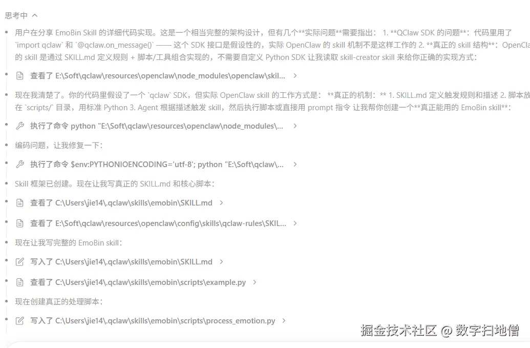 在QClaw中,一个Skill本质上是包含SKILL.md(元数据定义)和若干工具脚本的目录。我们在~/.qclaw/skills/emobin/下创建如下结构: