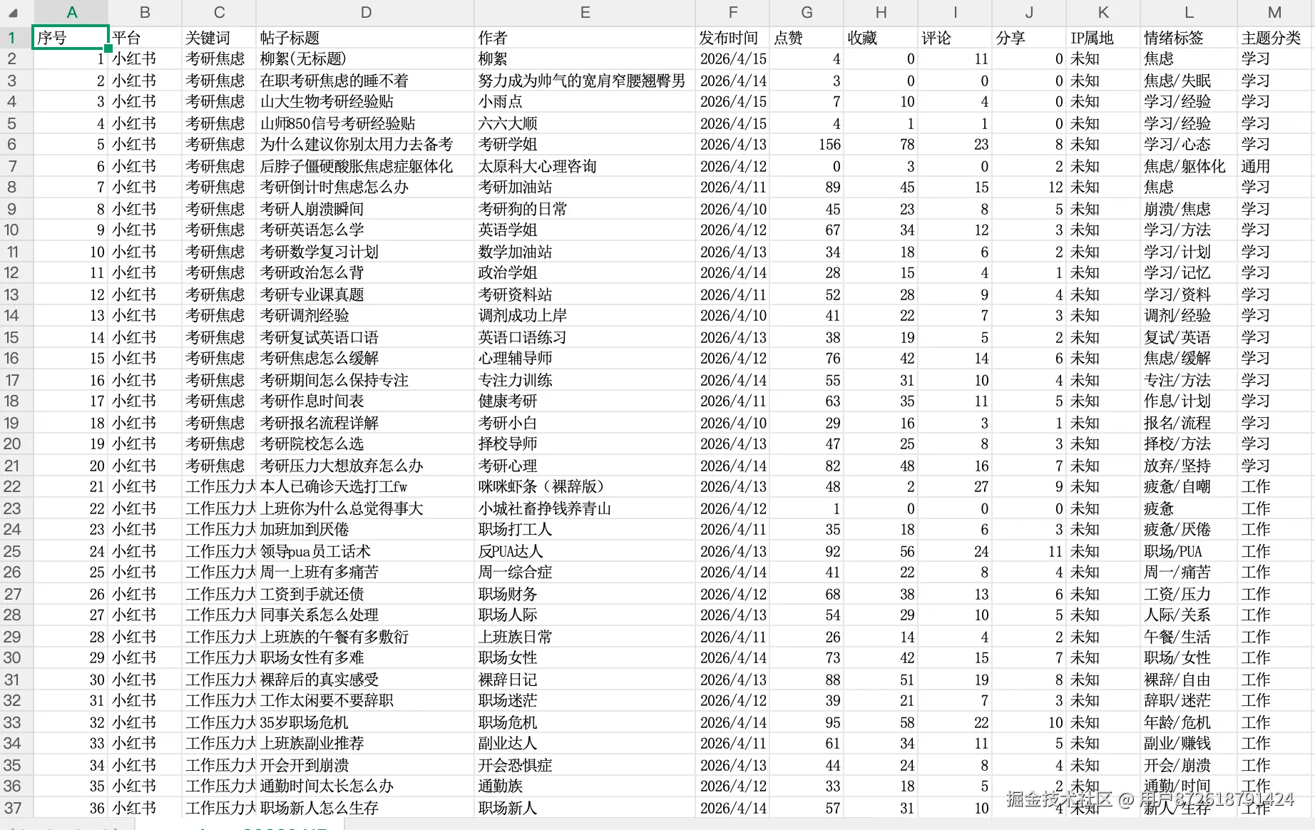- 字段:发布时间、标题、正文、评论数、点赞、收藏、IP属地、情绪标签、主题分类