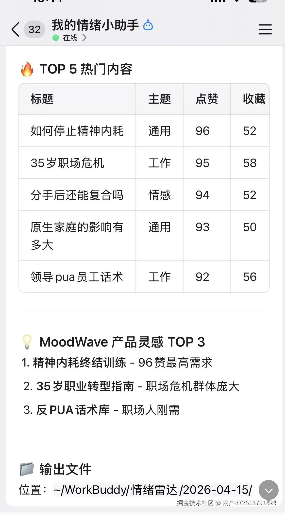 想法成型了:用 WorkBuddy 打造一个"情绪雷达&灵感捕手",专门为 MoodWave 的功能设计喂数据。