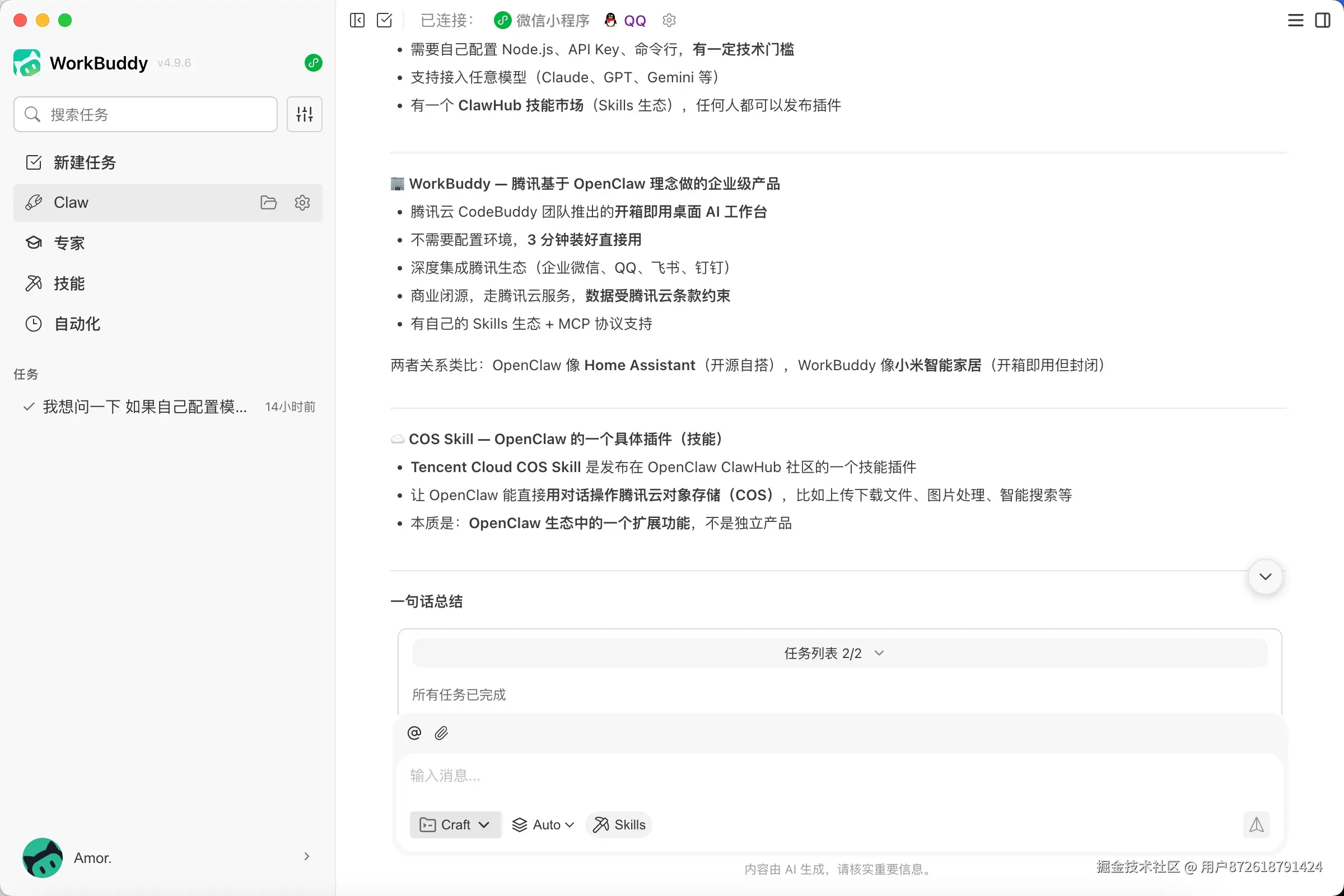 WorkBuddy 是腾讯 OpenClaw 生态推出的桌面 AI 工作台。和普通 AI 聊天工具不同,它的核心是 Agent——你给它一个目标,它自己规划步骤、调用工具、完成任务。