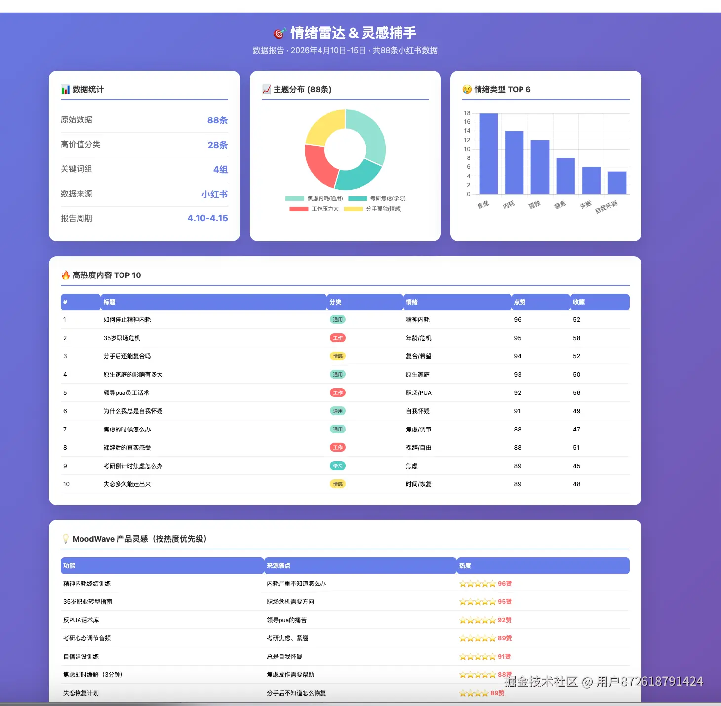 值得一提的是,本次抓取以'焦虑''压力''孤独'等关键词为主,数据样本天然偏向消极情绪。这是有意为之的第一步——先搞清楚用户最脆弱的时刻需要什么,再去设计整个情绪谱系。后续计划补充'元气满满''今天很开心''感恩记录'等正向关键词,构建完整的情绪地图。
