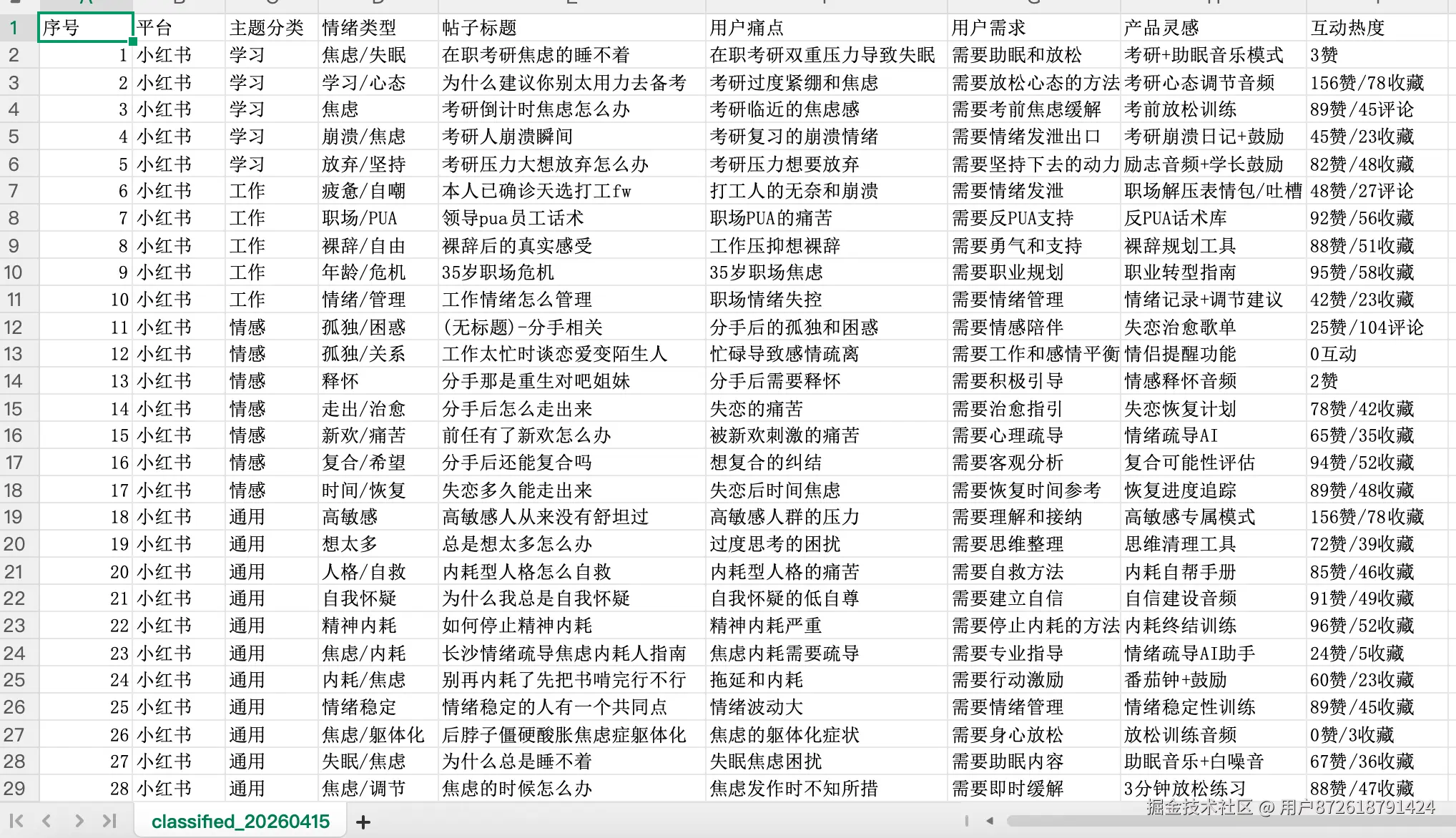 小红书上有几亿条真实的用户情绪记录。如果我能让 WorkBuddy 自动去搜索"考研焦虑"、"工作压力大"、"分手孤独"这些关键词,抓取帖子内容和评论,再用 AI 帮我分类、提取洞察——那我就有了一份真实的用户情绪数据库。