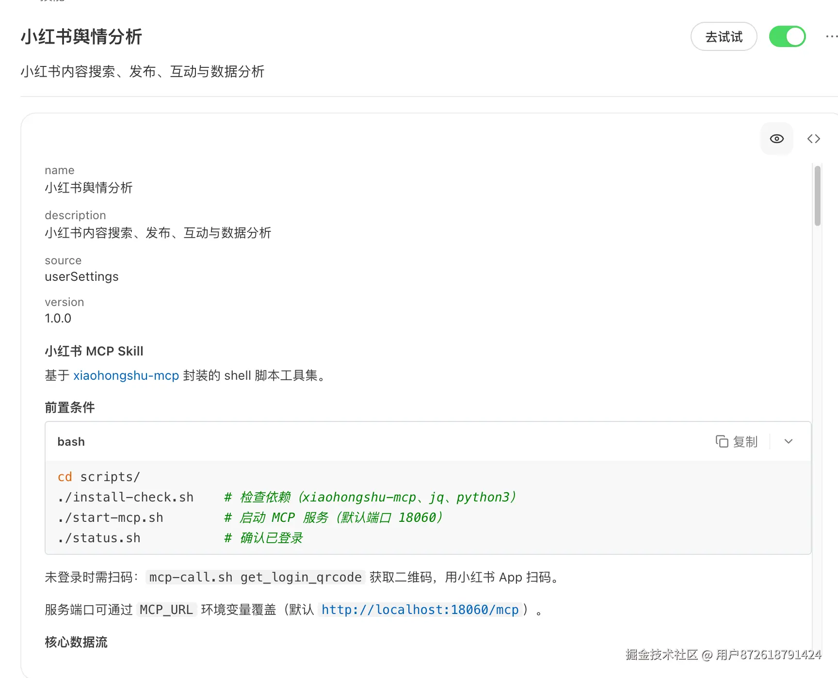 这个 Skill 基于 MCP(Model Context Protocol)协议,让 AI 可以直接调用小红书的搜索、帖子详情、评论等接口。