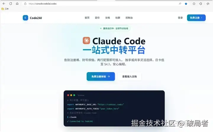 点击访问 → Code2AI - Claude Code 一站式中转平台