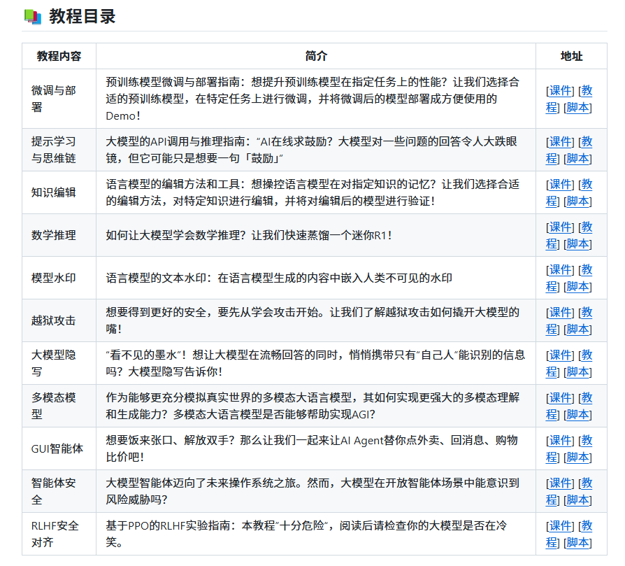 这是 上海交通大学出品的系列编程实践教程,来自《自然语言处理前沿技术》和《人工智能安全技术》两门课程的讲义。11个主题,从微调到安全,从提示工程到智能体,覆盖了大模型的核心技术。最重要的是——完全免费,公益性质。