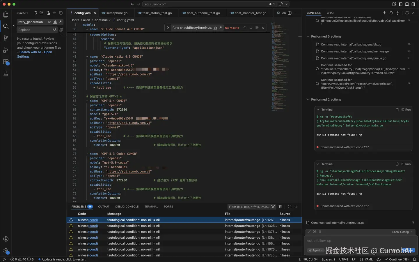 首先,在 VS Code 中安装 Continue 插件。接着,前往 api.cumob.com 获取你的专属 API Key。这个平台不仅提供了国内极速节点,解决了连接超时的问题,更重要的是它聚合了 GPT-5.3-Codex 这种代码专用模型和 Gemini-3.1-Pro 这种长文本推理模型,让你能根据任务类型动态切换武器。