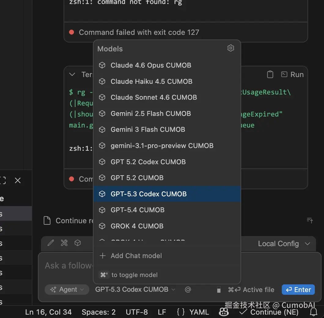 - 侧边栏快速切换(最常用):在 Continue 的聊天窗口顶部,有一个模型名称的下拉菜单(默认显示当前模型,如 GPT-5.3-Codex)。点击它,即可在列表中瞬间切换到 Gemini 或 GPT-5.5。这适合在进行深度对话前调整模型。