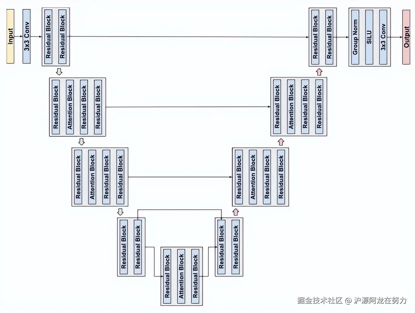 解码器用的是一种叫做 UNet 的架构。UNet 是什么?它是一个长得像 U 形的神经网络,左边一层一层往下采样(压缩图像,提取特征),右边一层一层往上采样(恢复分辨率,画细节),中间还有“跳跃连接”把左边的细节直接送到右边,防止信息丢失。这个结构在图像分割、生成领域已经被证明非常强大。