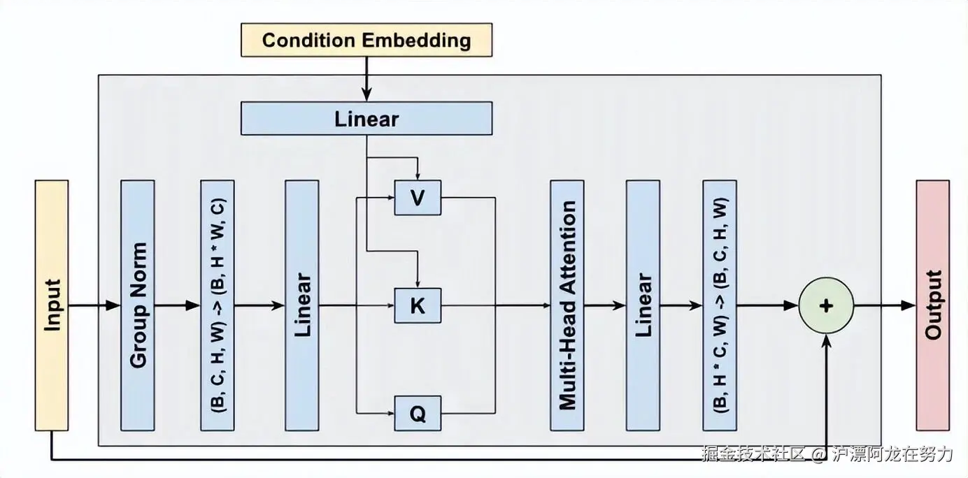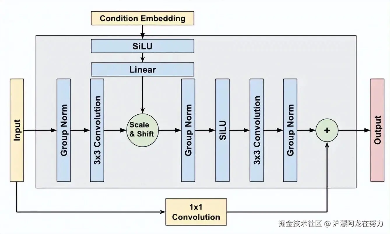 :负责学习图像的局部特征,比如边缘、纹理、颜色。每个残差块内部有两层卷积,中间夹着激活函数和归一化。特别的是,残差块会用一种“缩放与偏移”的方式把条件信息(比如图像嵌入和时间步嵌入)融入进去:先对特征做缩放(乘以一个数),再加一个偏移量。这比直接把条件信息加上去效果更好。残差块最后还会把输入直接加到输出上(就是“残差连接”),这样能防止网络太深导致训练困难。