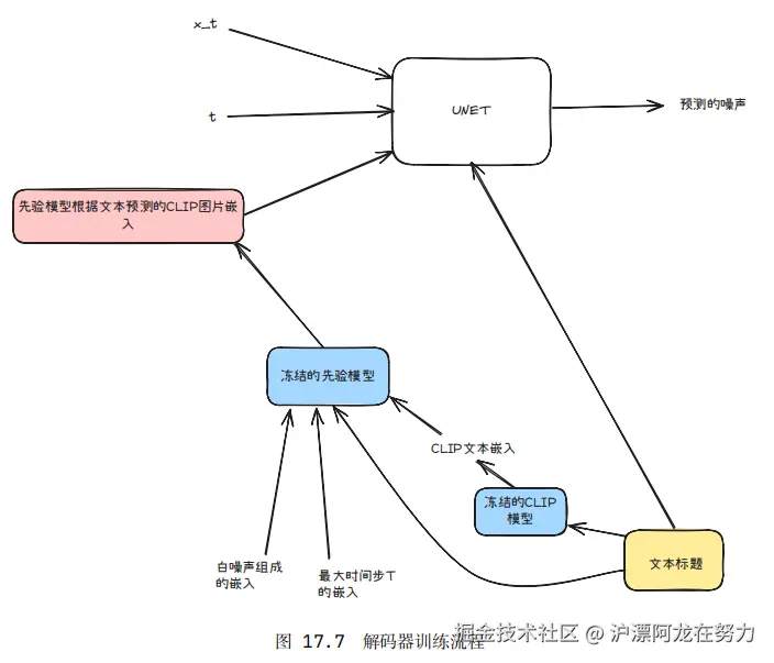 解码器的训练:训练解码器时,CLIP 和先验模型都已经被冻住了。训练数据里,我们有一张清晰图像和一个文字描述。首先,随机选一个时间步 t,给图像加上 t 步的噪声。然后把噪声图像、时间步 t、以及先验模型预测的图像嵌入(从文字描述得来)一起送进解码器。解码器输出预测的噪声。损失函数就是预测噪声和真实噪声之间的均方误差。反复训练后,解码器就越来越擅长去噪了。