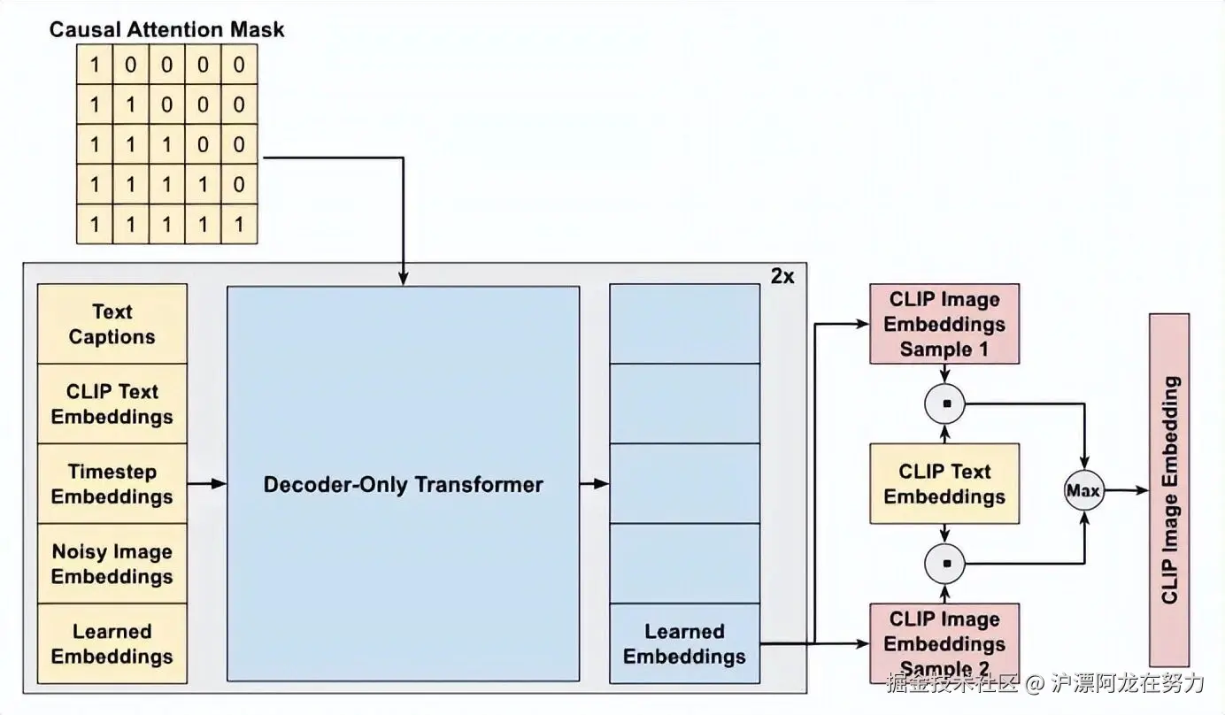推理时的一个小聪明:先验模型在真正使用时,会一次生成两个候选的图像嵌入,然后分别跟文本嵌入计算“点积”(可以理解为相似度),选那个更相似的作为最终输出。为什么要多此一举?因为随机采样可能有坏运气,生成两次选好的,能显著提升质量。这叫做“重采样技巧”。