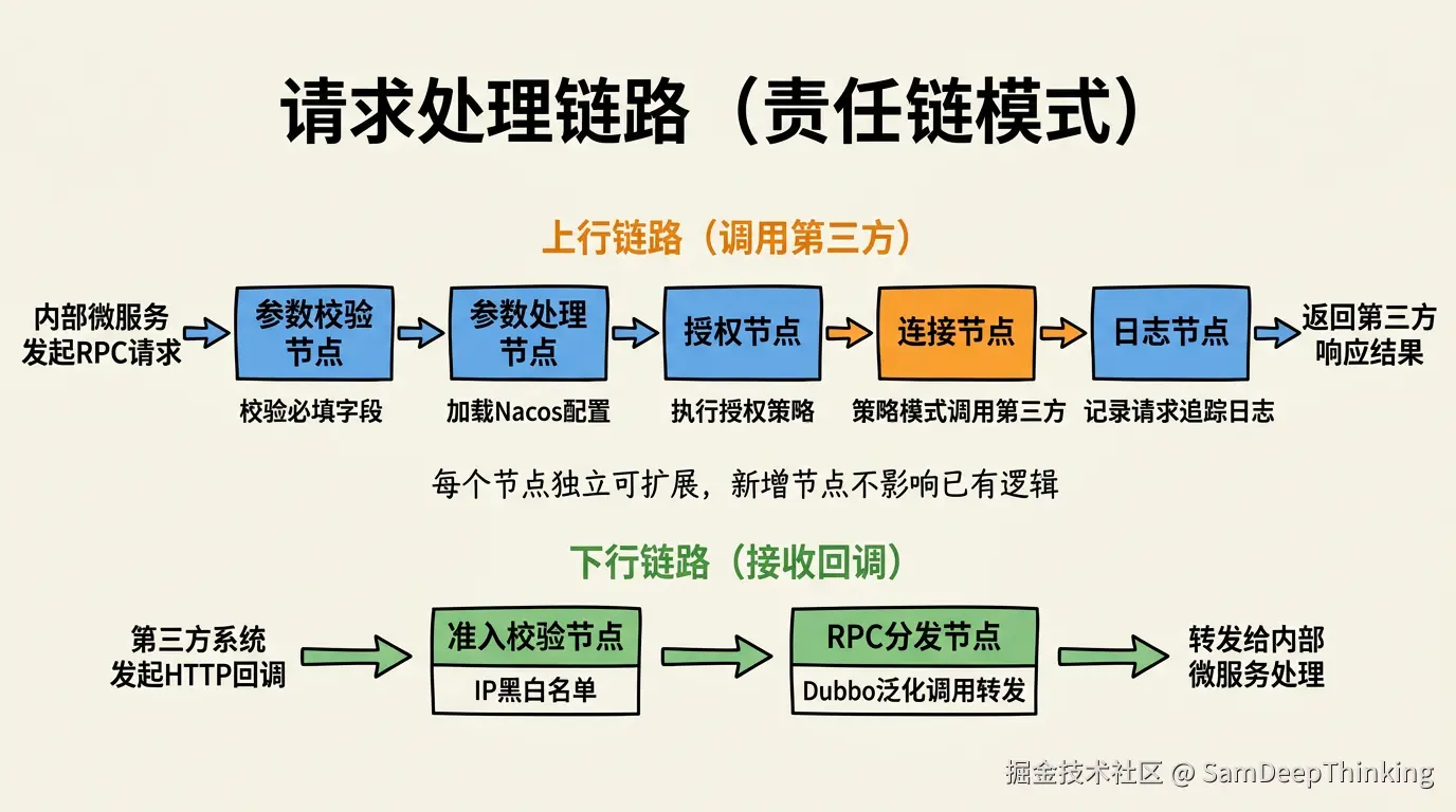 不管是出口请求还是入口请求,都需要经过一系列处理步骤:参数校验、配置加载、授权、调用、日志记录。把这些步骤拆成独立的节点,用责任链串起来。