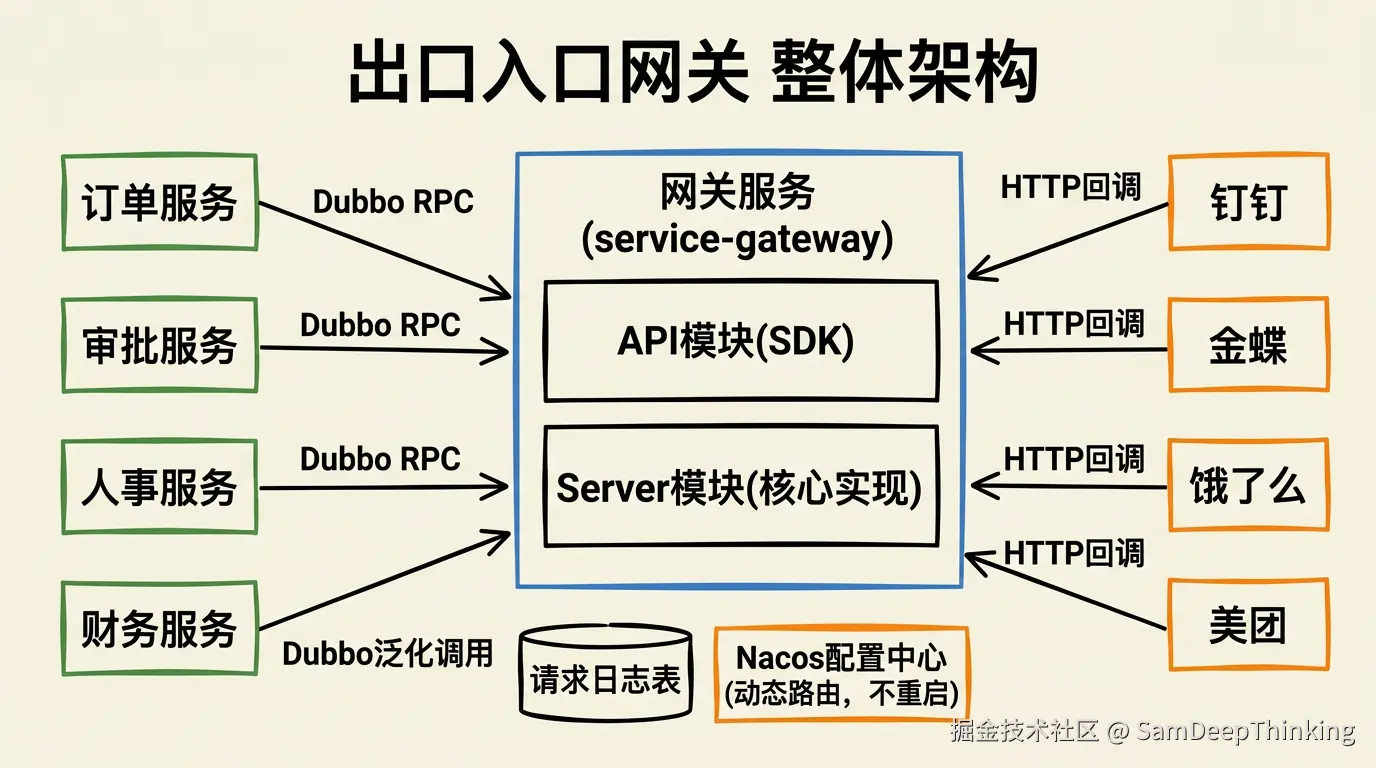 出口:内部微服务需要调用第三方系统的接口时,不直接调,而是通过网关去调。网关负责处理认证、签名、参数转换这些和第三方对接相关的脏活。