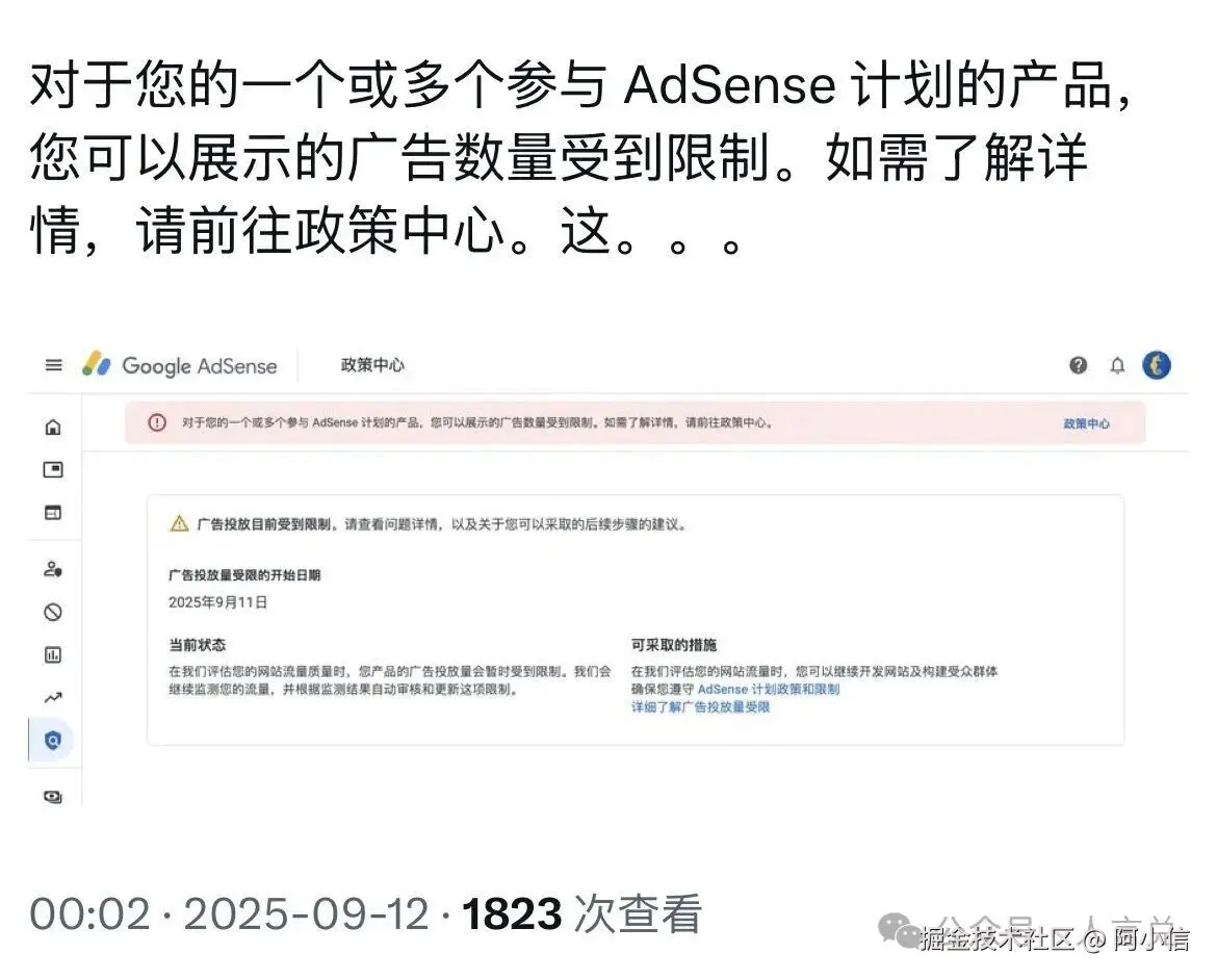 2025年9月12号,我在adsense后台突然看到一条红色提醒: