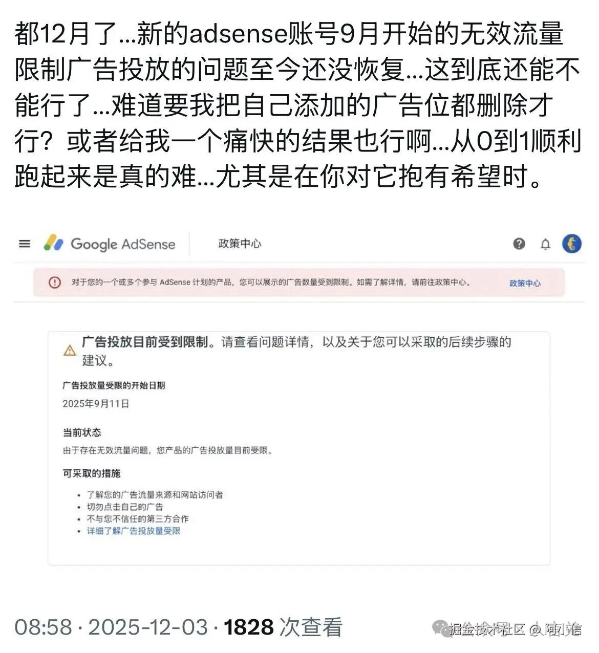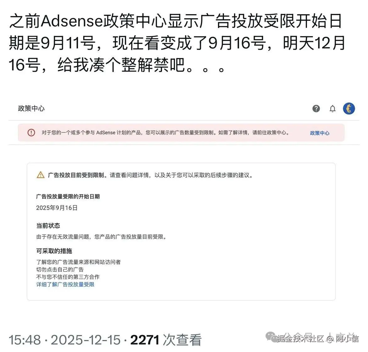 我的adsense(谷歌广告)账号存在无效流量的问题在2026年4月12日终于恢复了……