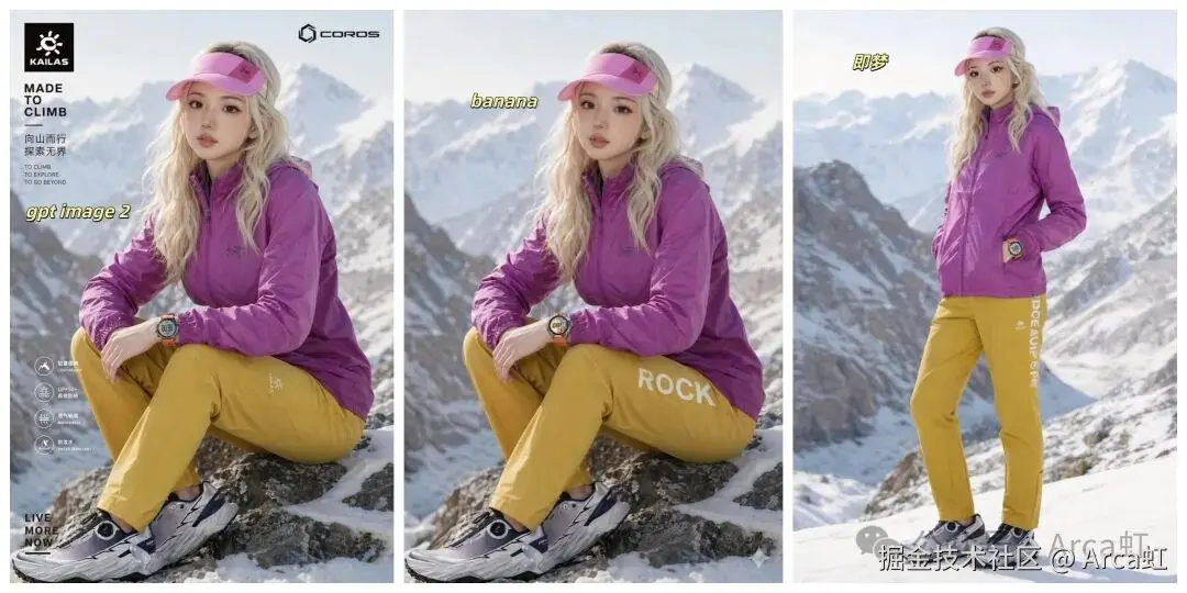 然后,生成了一张模特海报图,人物的效果几个平台都挺不错的(即梦4张图里面只有一张人脸没失真的),衣服是gpt image 2 的还原度更好一些(logo是对的)。而gpt image 2还有海报效果。